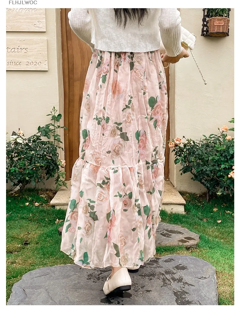 Chic Korea Clothes Summer Women Cute Sweet Girls Floral Printed Robe Holiday Date High Waist Ruffles Pink Long Maxi Skirts