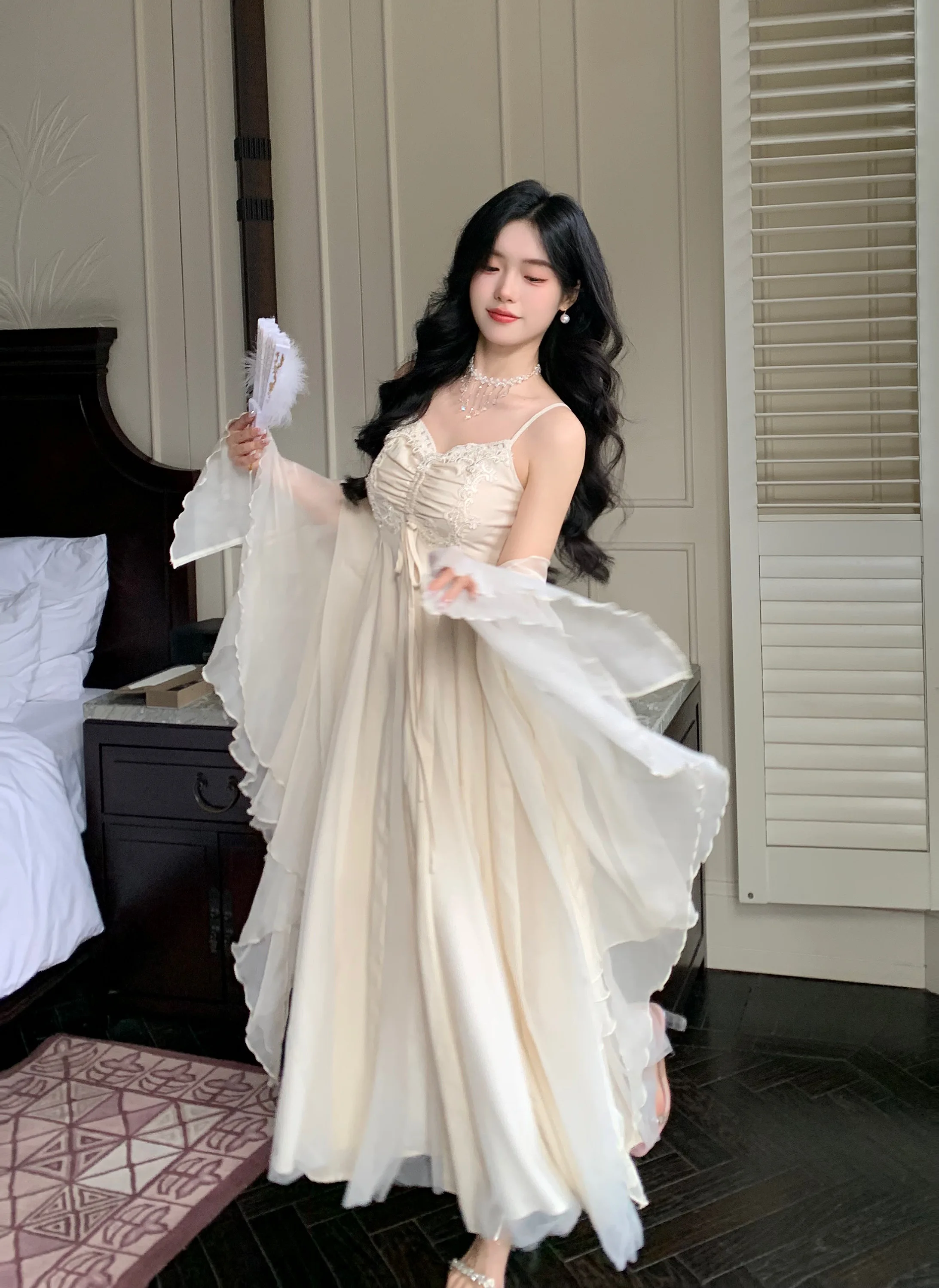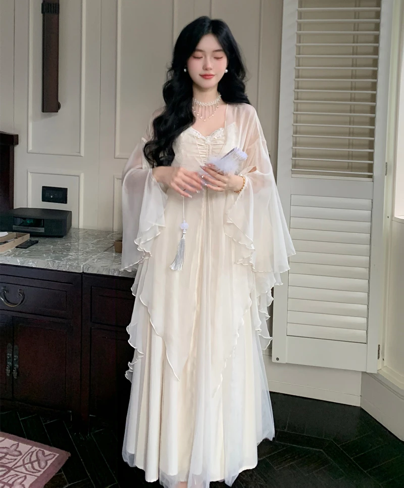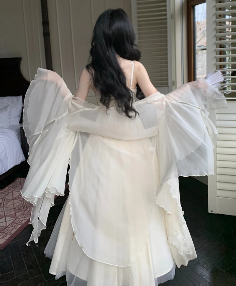 Spaghetti Straps White Chiffon Long Women's Summer Holiday French Elegant Irregular Ruffle Fairy Dress Chiffon Cardigan