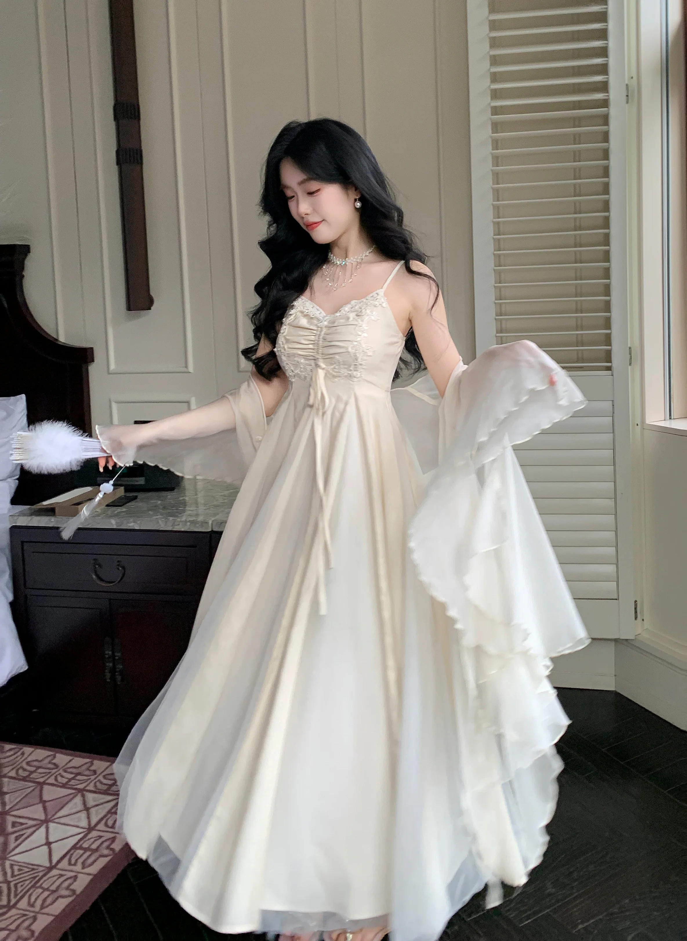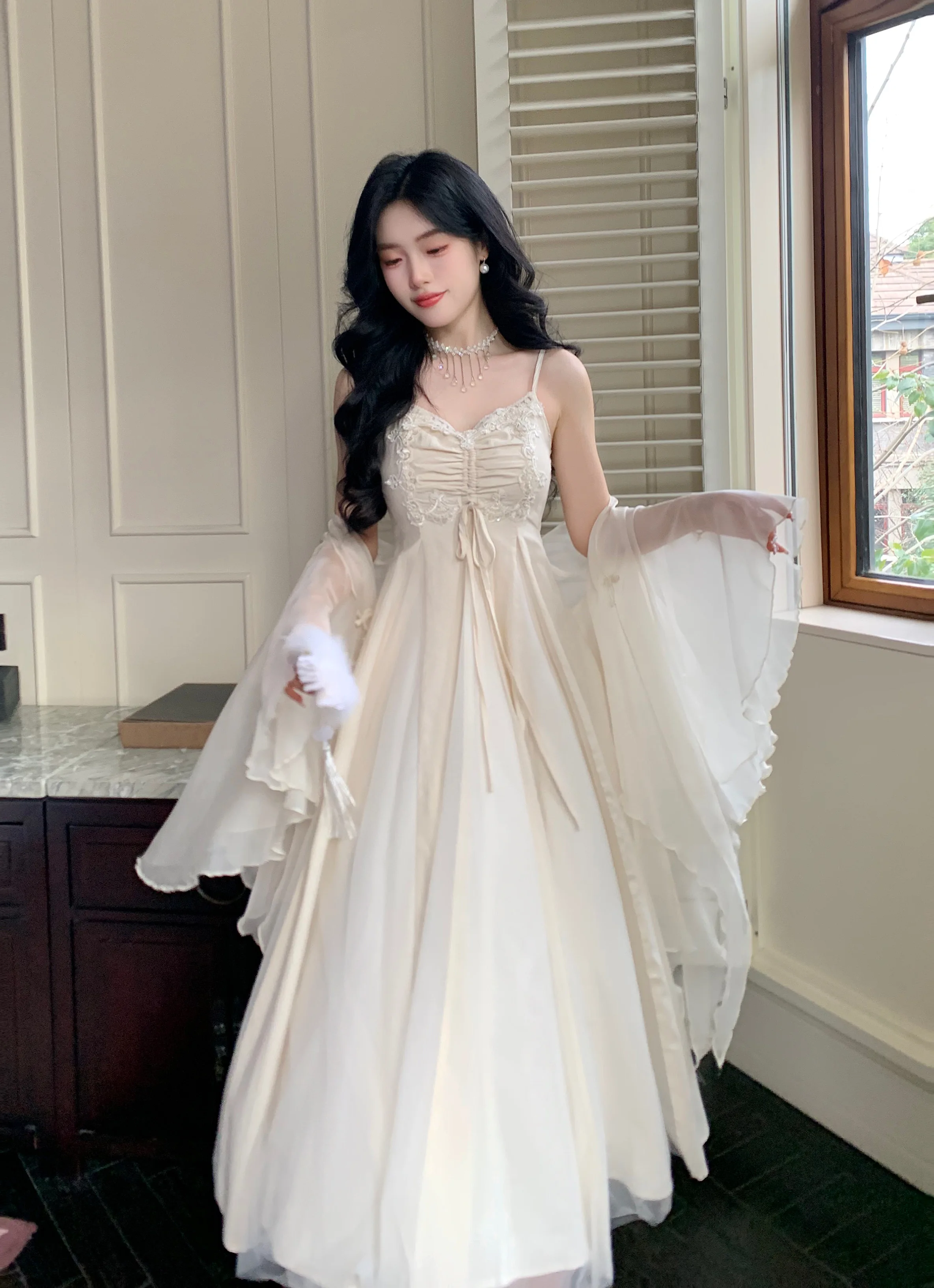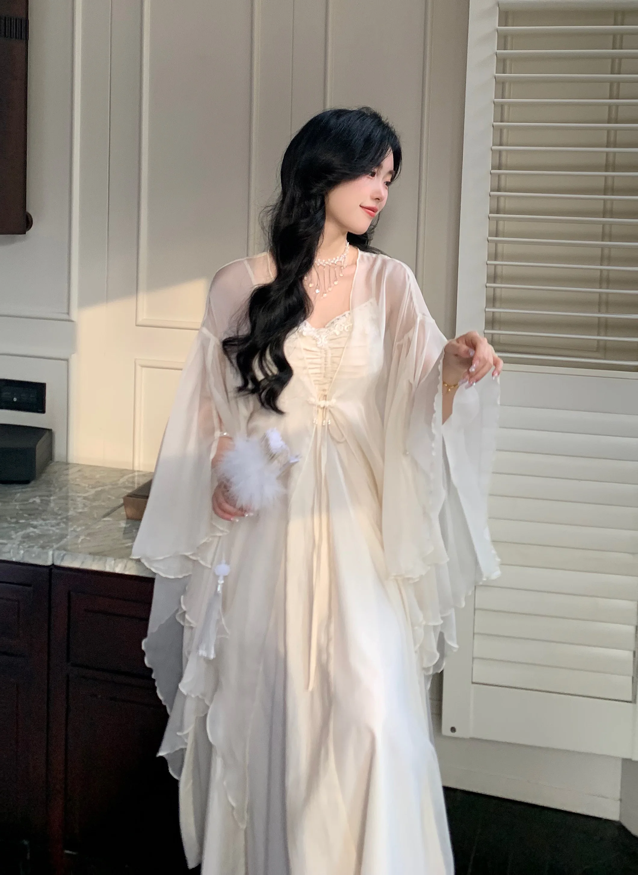 Spaghetti Straps White Chiffon Long Women's Summer Holiday French Elegant Irregular Ruffle Fairy Dress Chiffon Cardigan