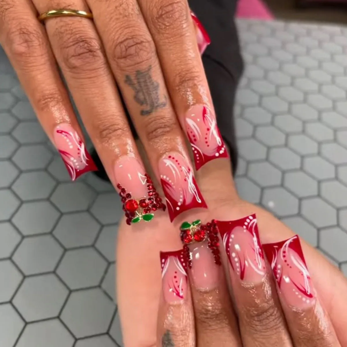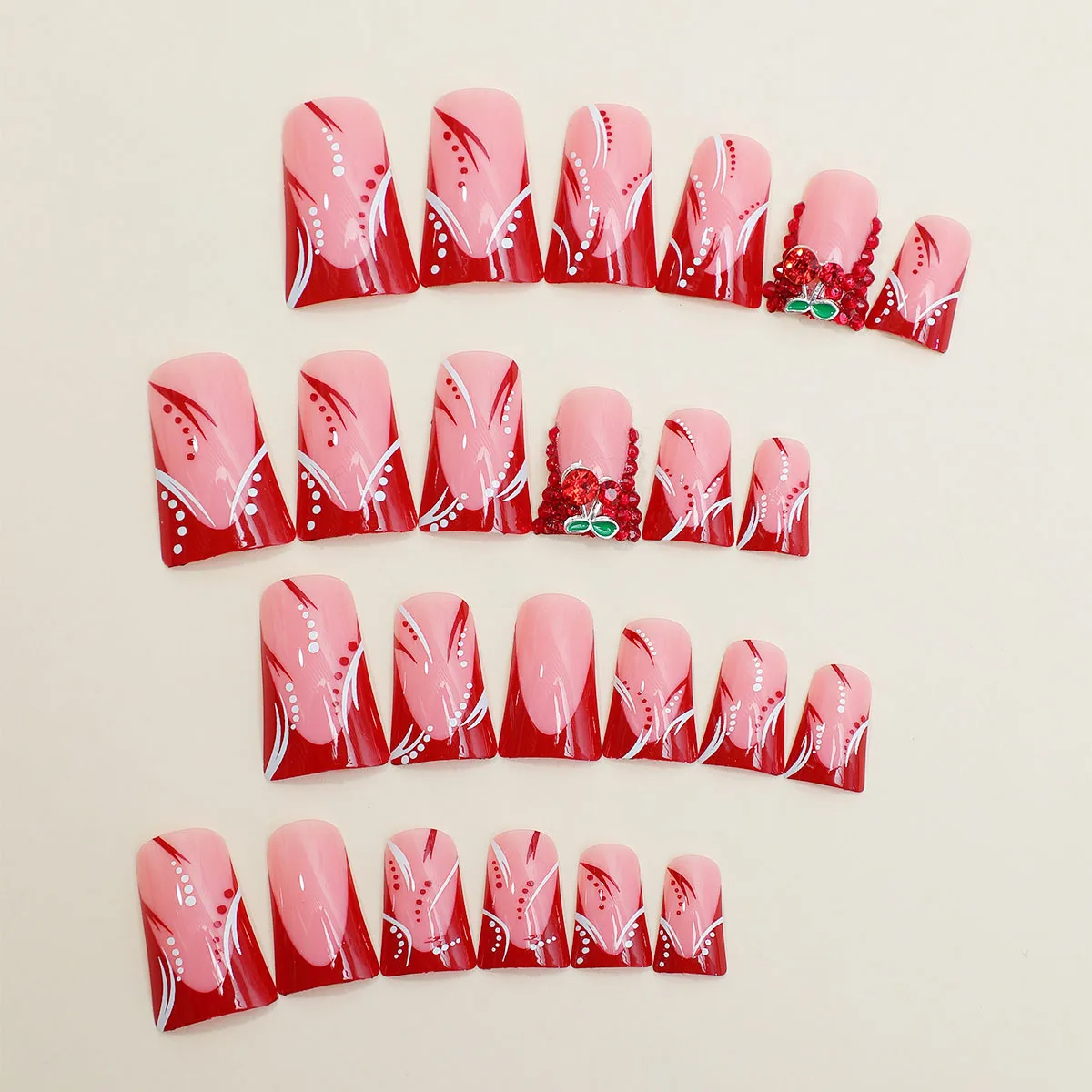 24pcs French Press on Nail Duckbill shaped False Nails with Red Rhinestone Design European Wearable Full Cover Fake nails Tips