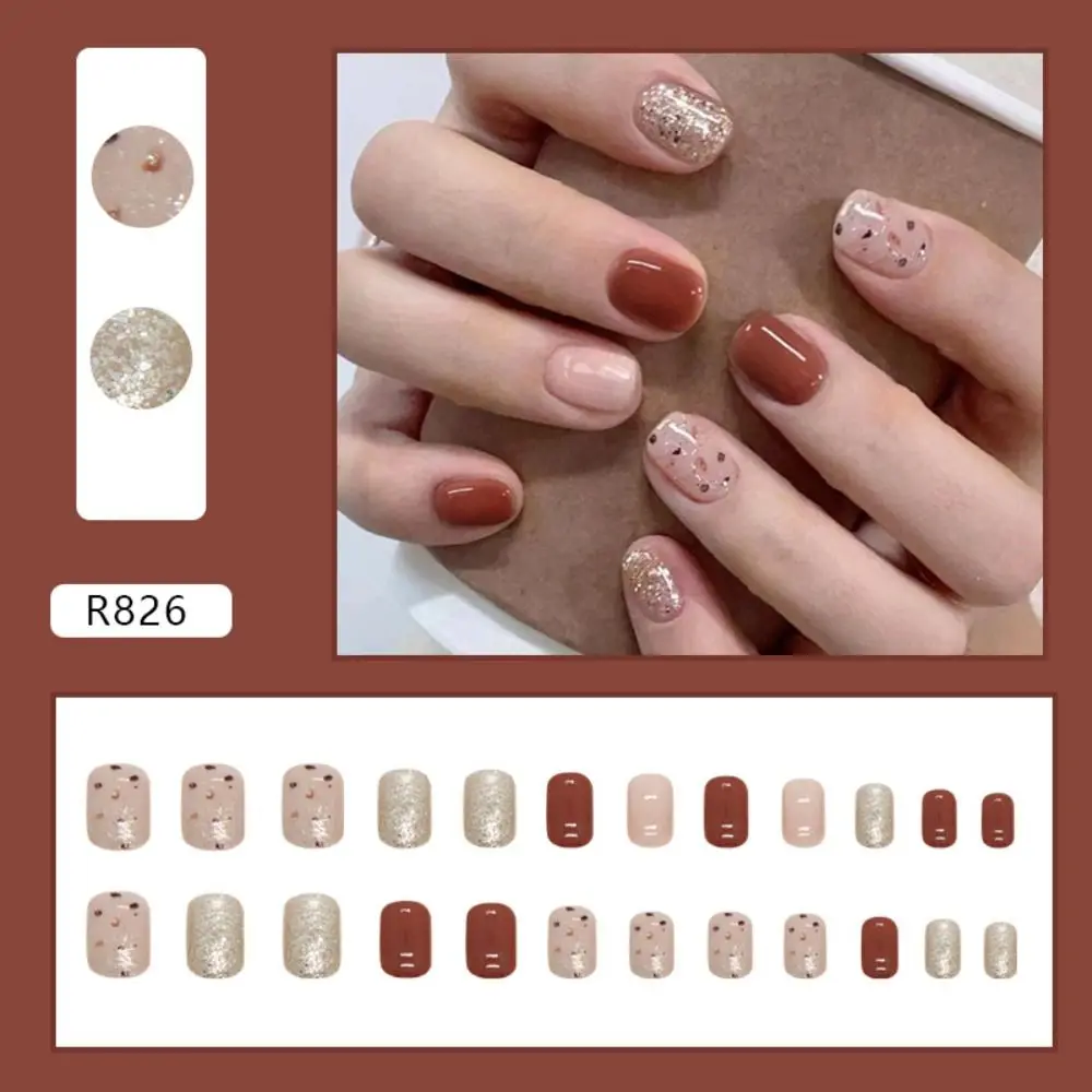 24pcs Short Round False Nails French Ballet Nail Little Bear Leaf Gold Slices Full Cover Detachable Press on Nail Tips