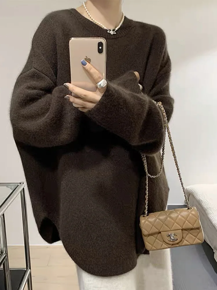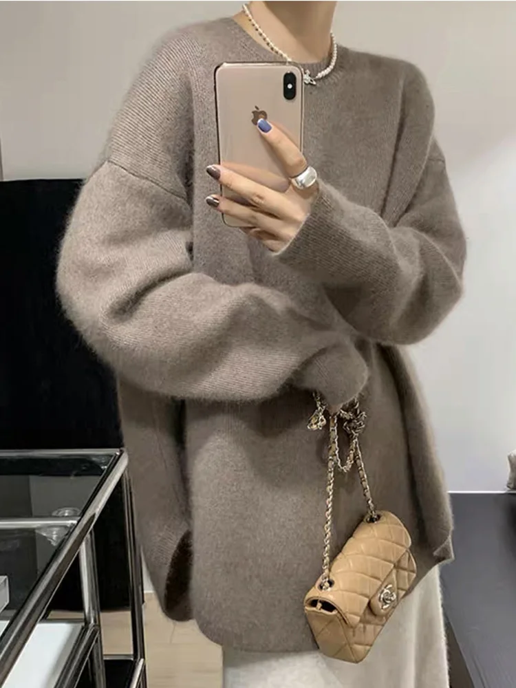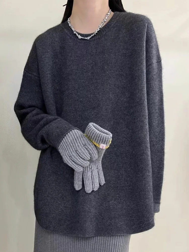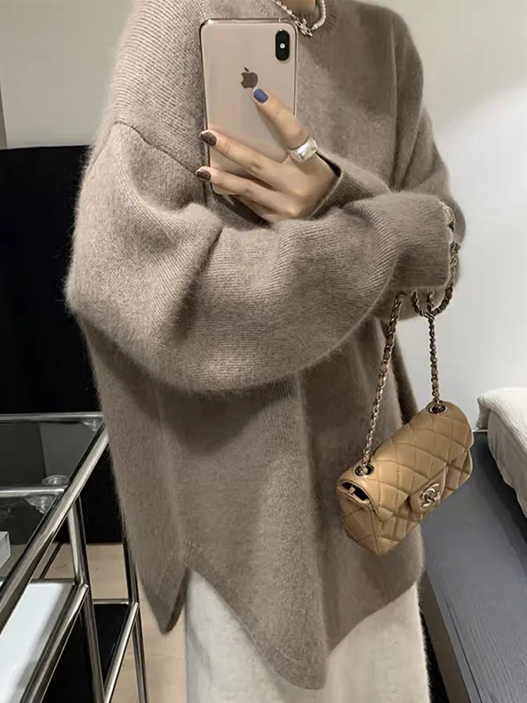 Solid Knitted Sweater Women Split Oversized O-neck Casual All-match Pullover Female Long Sleeve Fashion Soft Gentle Jumper Top