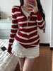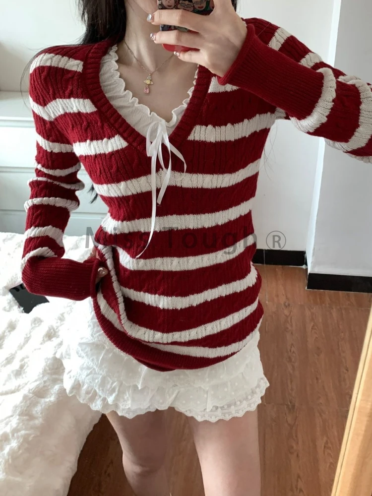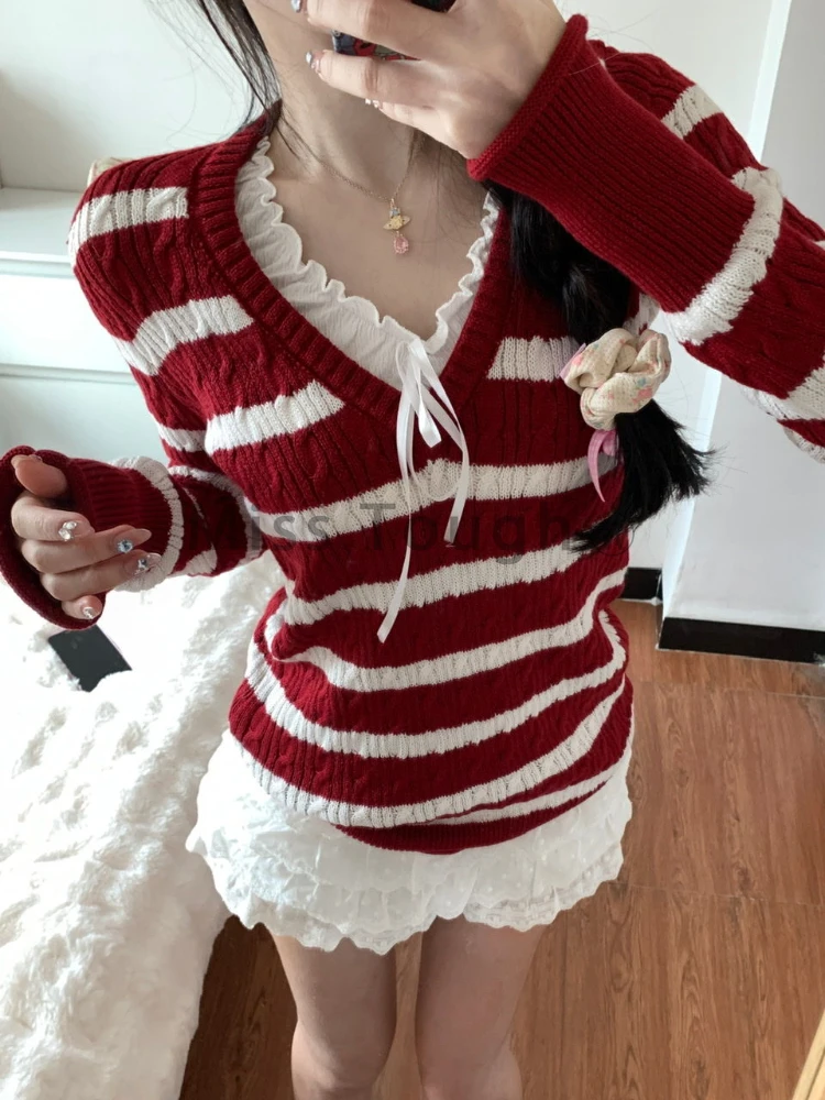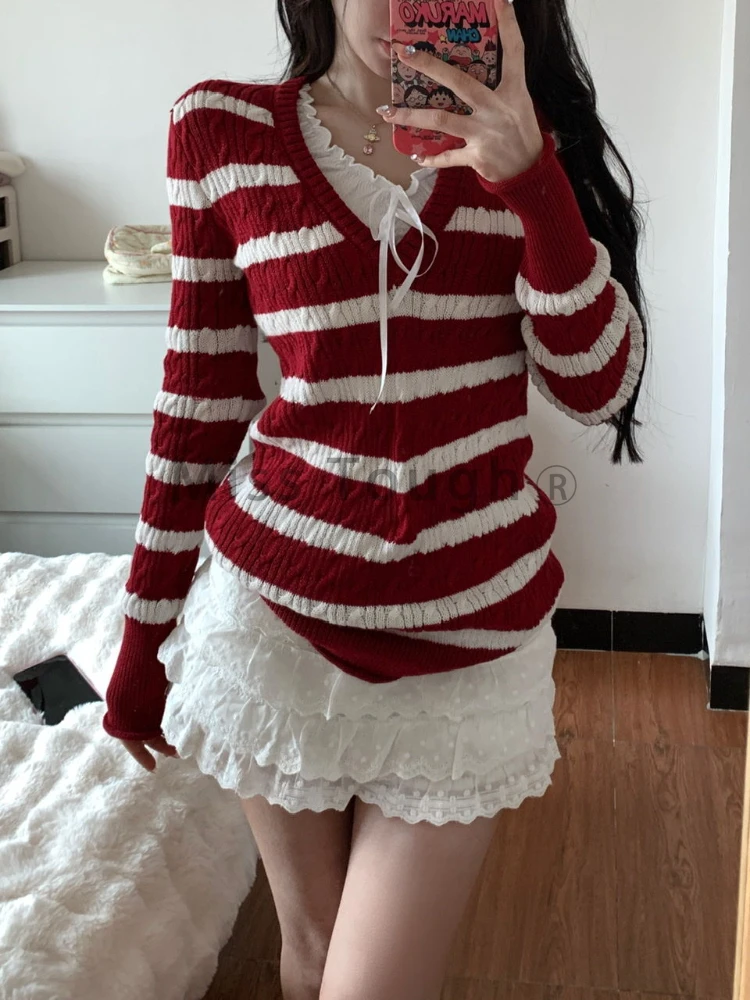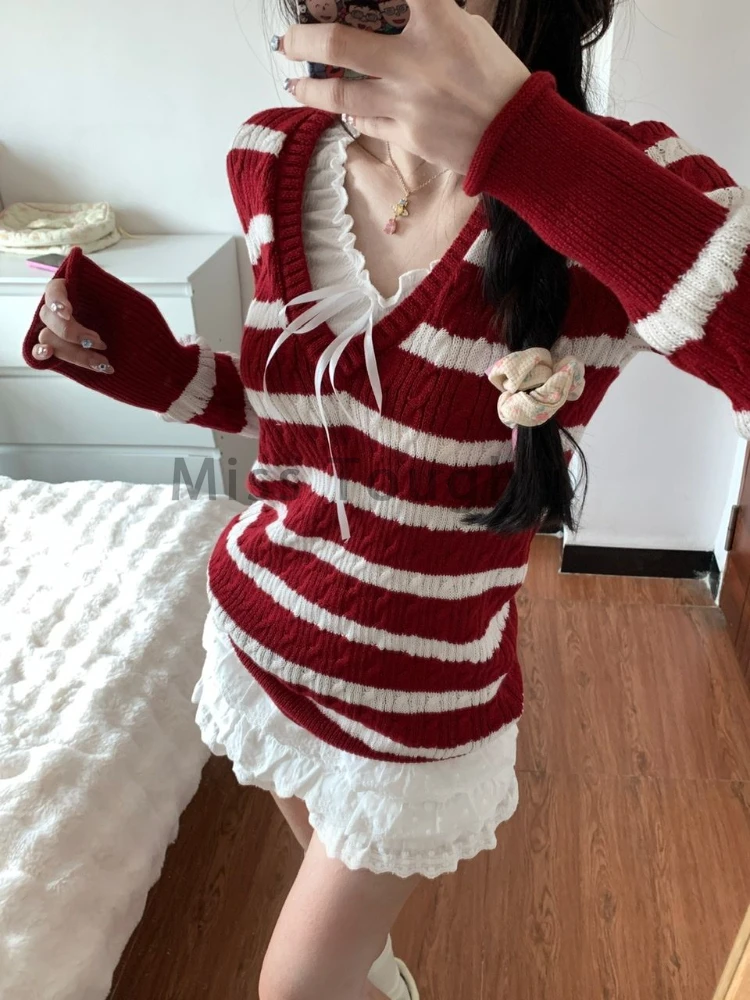 Autumn Sweet Knitted Three Piece Set Women Korea Chic Stripe Contrast Color Skirts Suit V-neck Sweater + Cute Sling + Skirt Sets