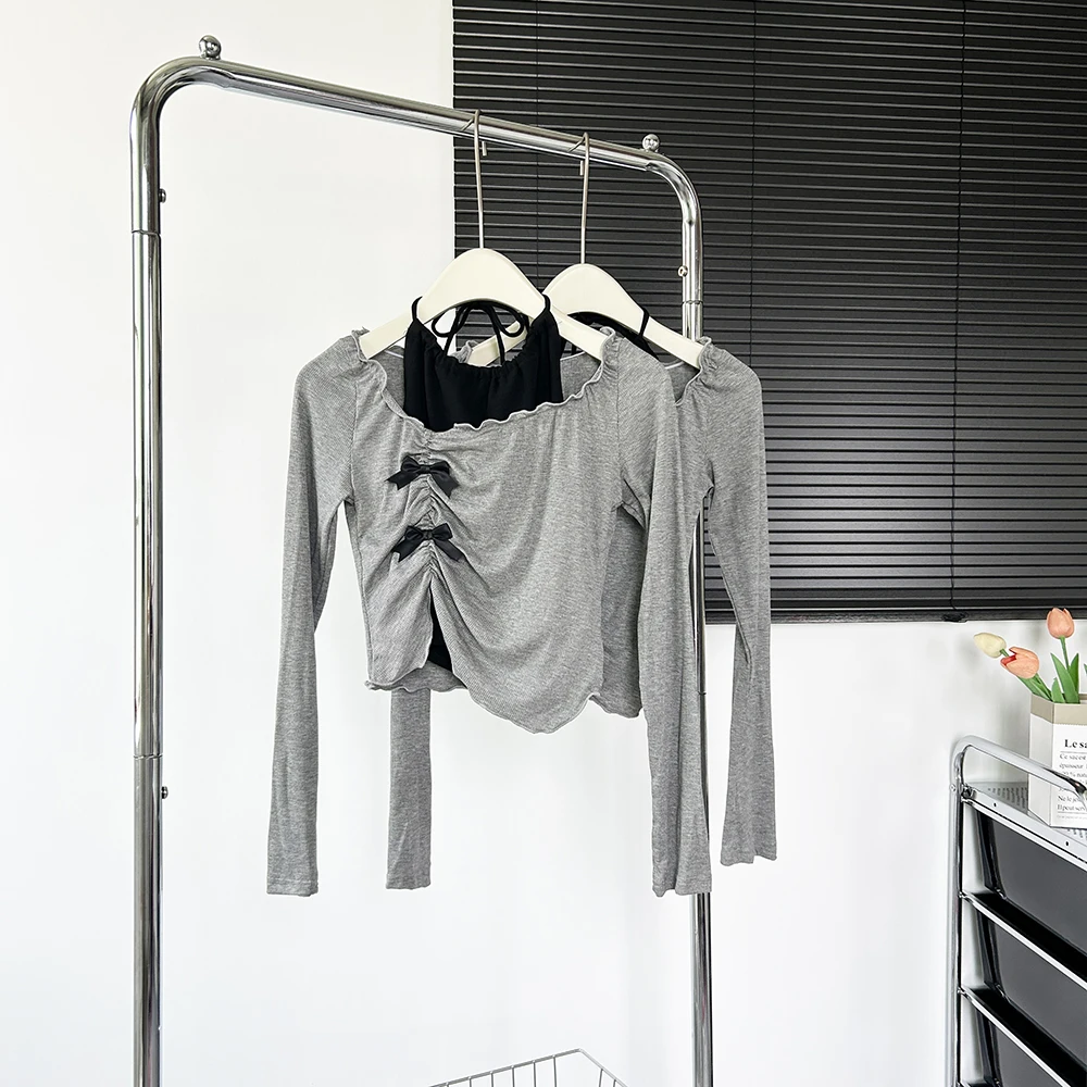 Autumn Women Two Pieces Set Halter Top Korean Fashion Gyaru Long Sleeve Crop Tops T-Shirts Y2k Streetwear Tees Coquette Girl New