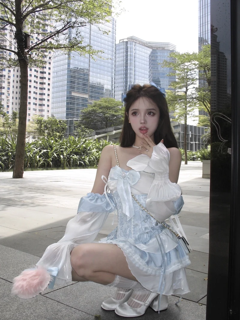 Blue Japanese Style Kawaii Lolita Dress Women Sexy Slash Neck Bow Elegant Party Mini Dress Female Korean Fashion Princess Dress