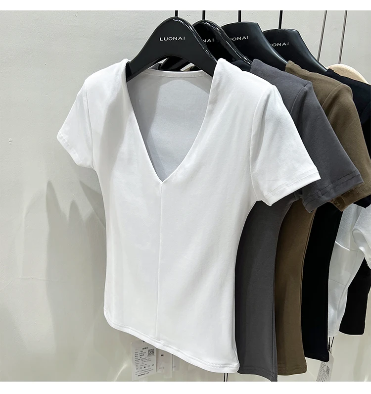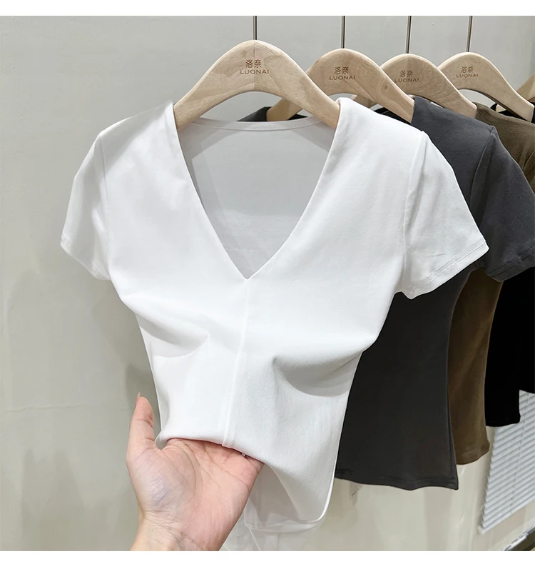 Casual Cotton V Neck Short Sleeve T-shirt Women Fashion Shoulder Pad Solid Color Summer Slim Tees Ladies Basic Elastic Tops