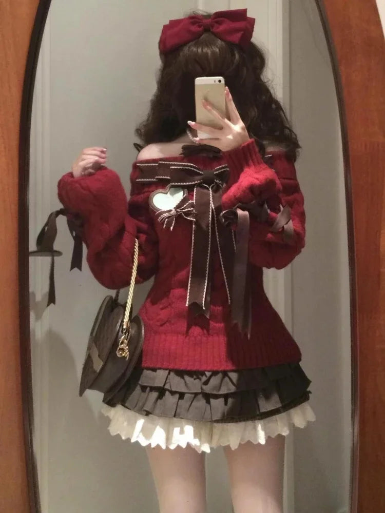 Chirstmas Knitted Sweater Women Winter Off Shoulder Red Pullover Y2k Vintage Clothing Slim Fit Jumpers Casual Long Sleeve Korean