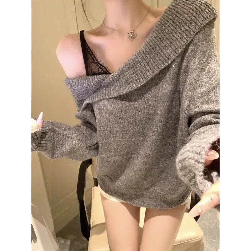 cute winter outfits 2000s Vintage Cltohing Long Sleeve Sweater Gyaru Off Shoulder Jumpers Korean Winter Women Casual Fake Two Pieces Knitwear Y2k