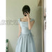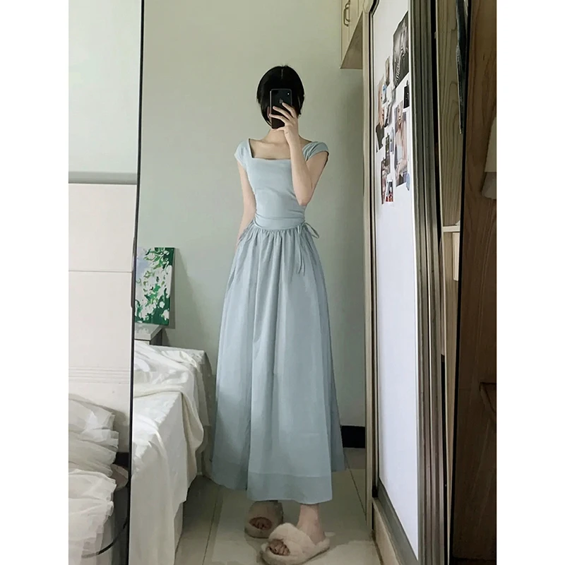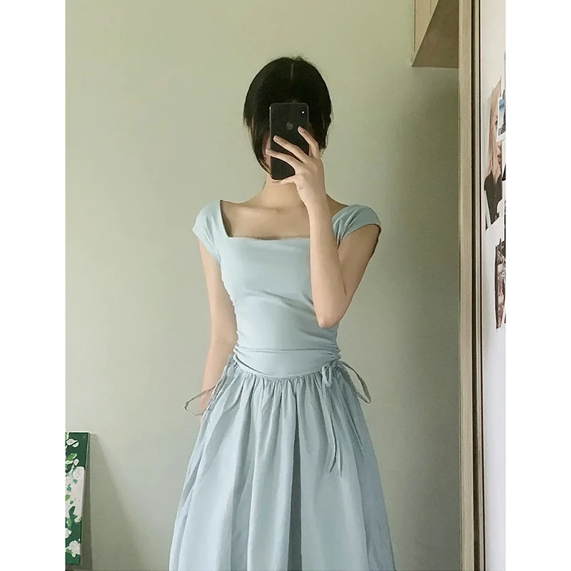 Elegant Cotton Blue Midi Dress Summer Korean Short Sleeve Beach Style Sundress Party Even Office Lady Sexy Corset Dress Women