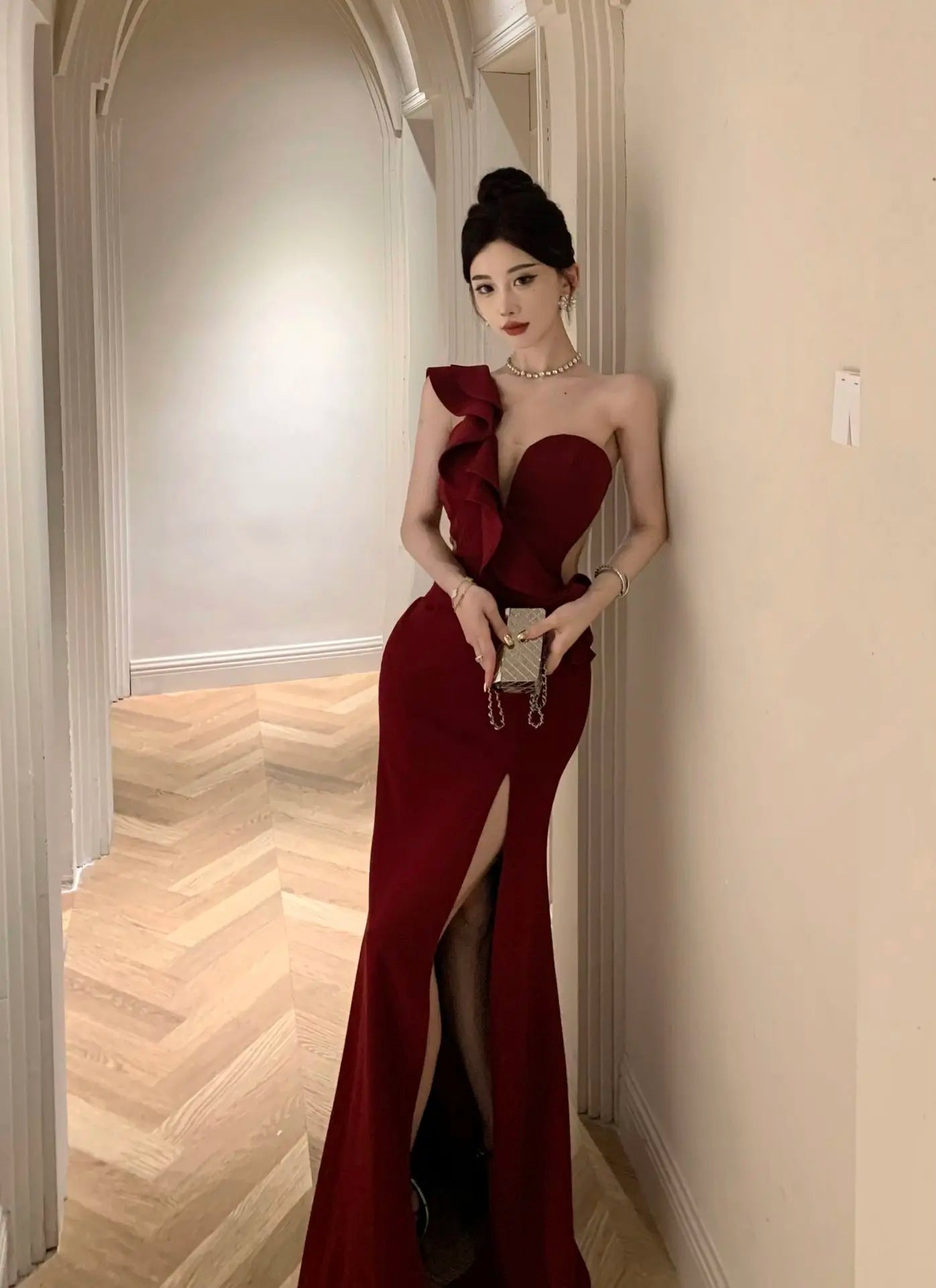 Elegant Fashion Wedding Evening Party Long Dresses for Women Sexy Split Sleeveless Slim Ladies Vintage Red Prom Female Clothing
