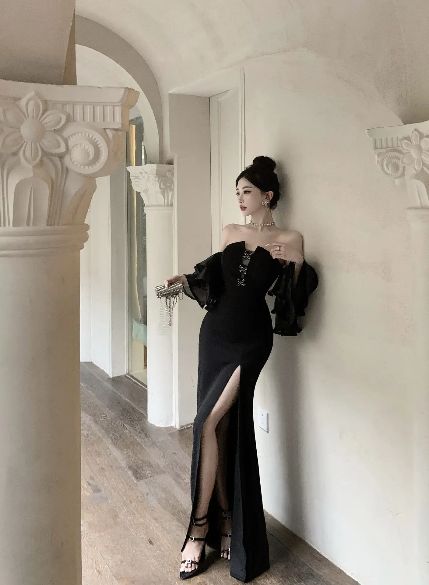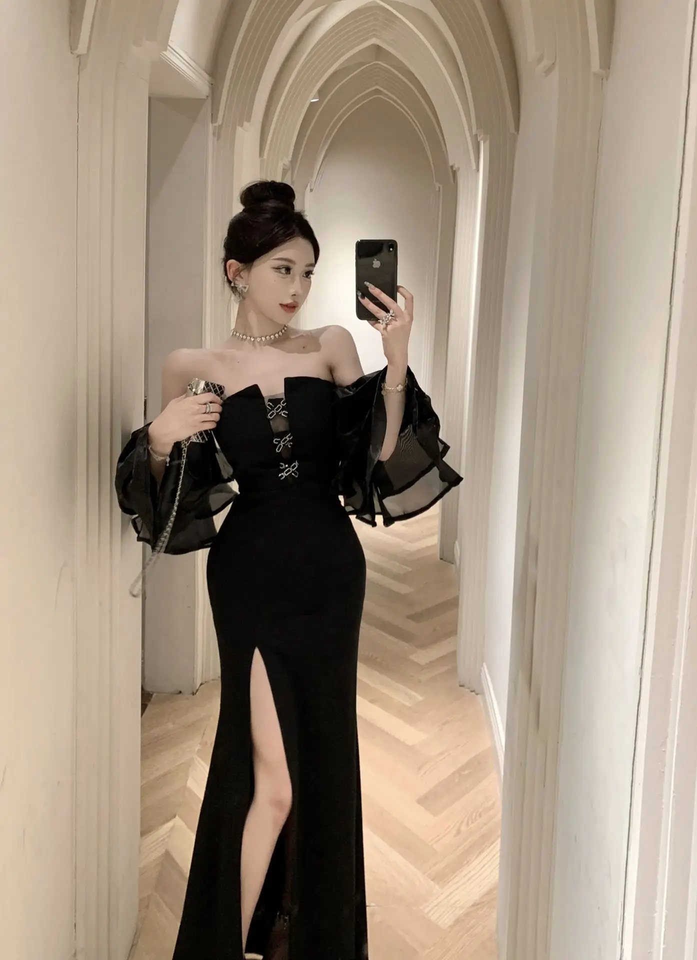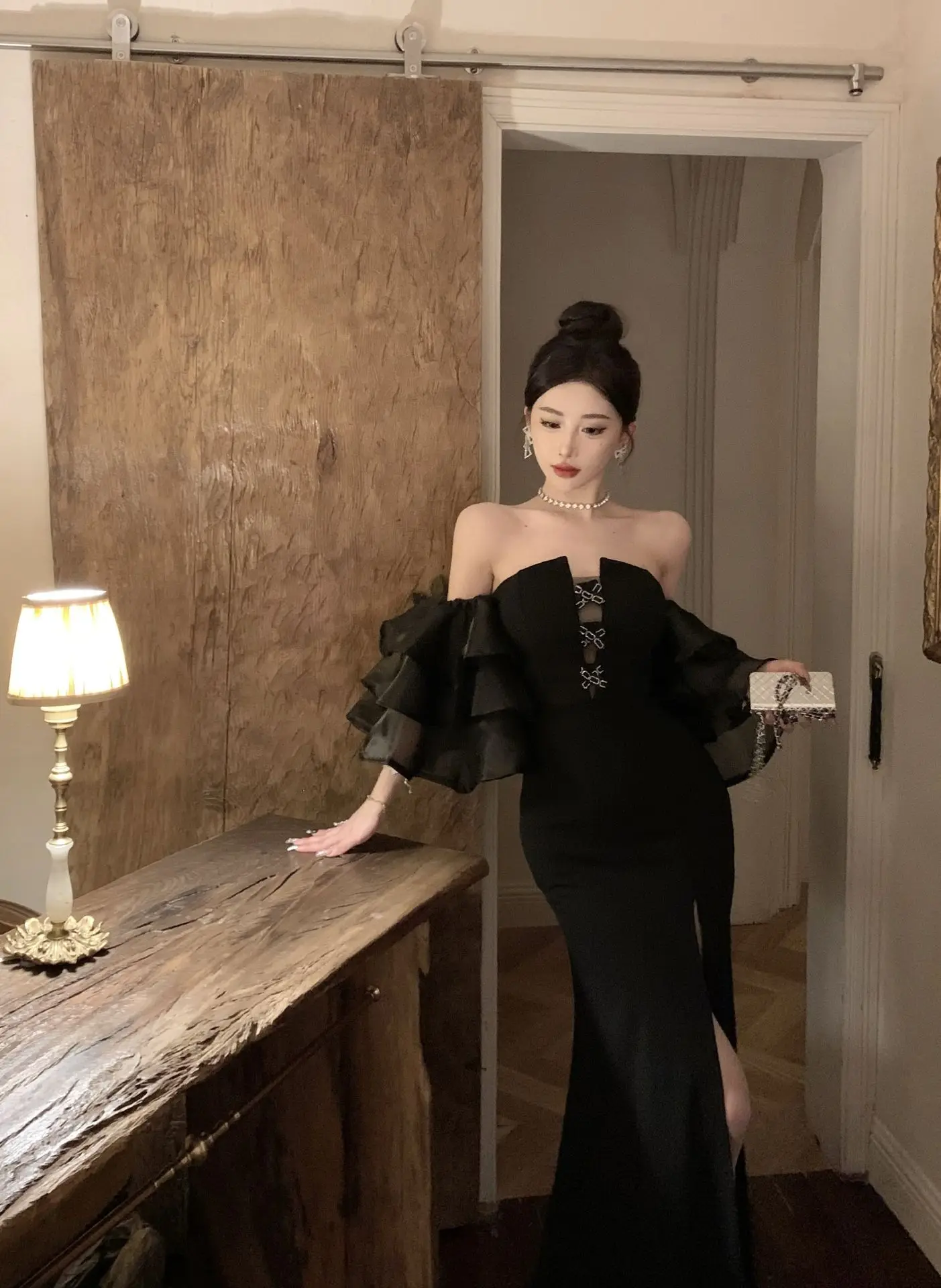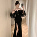 Elegant Party Dress Women High End Lantern Sleeve Strapless High Waist Split Long Dresses Korean Fashion Slim Vestidos