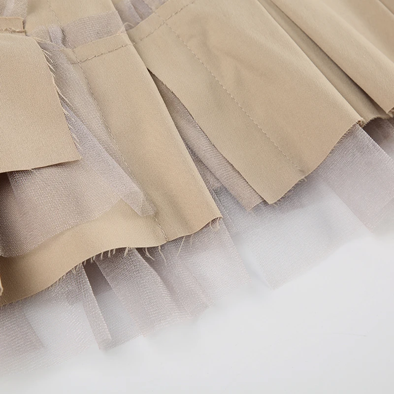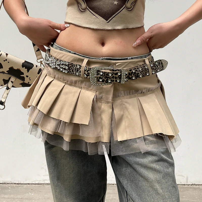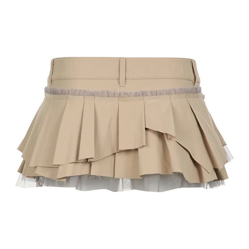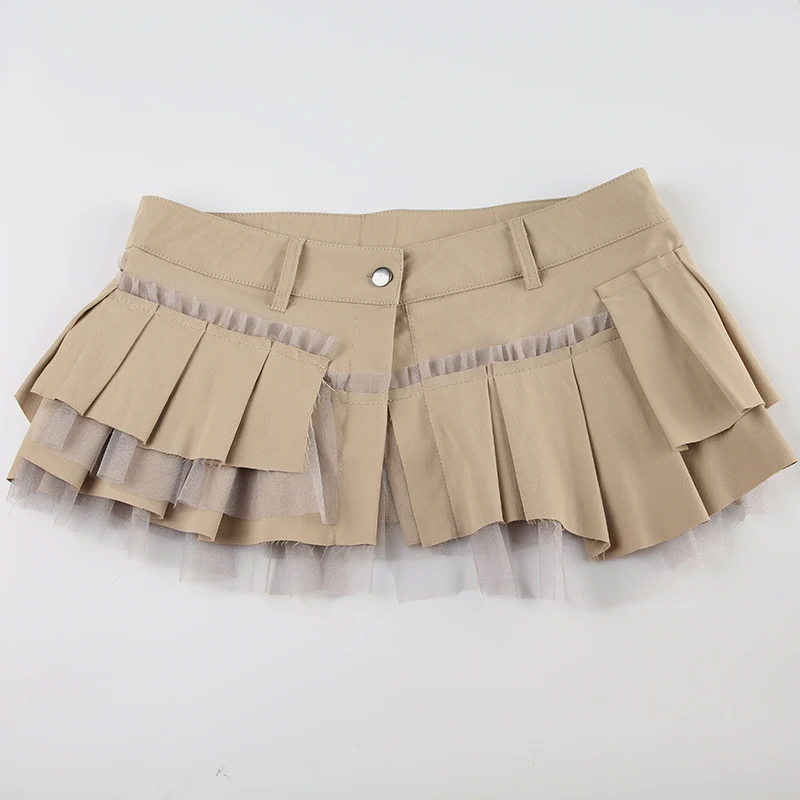 Fairycore Grunge A-line Cargo Skirt Khaki Low-waisted Mesh Patchwork Pleated Super-short Skirts Layering Bottoms Street