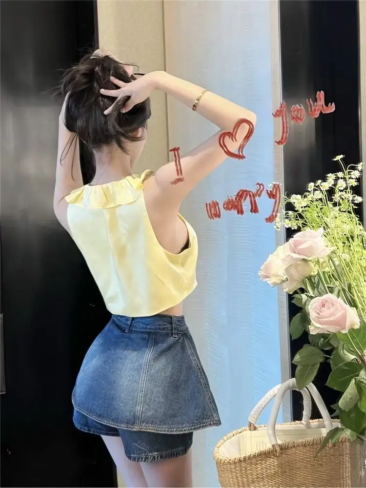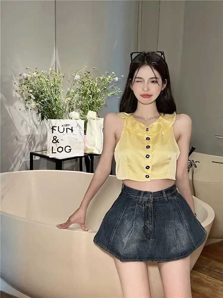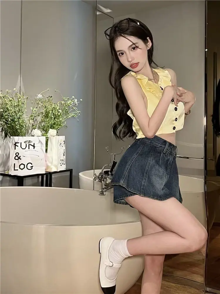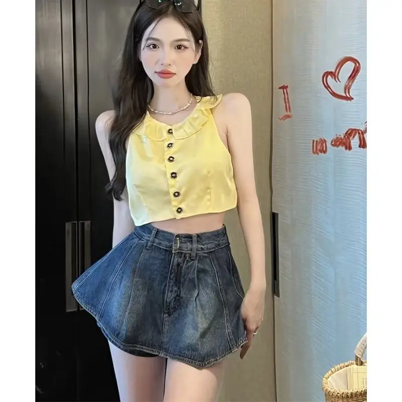Fake Two Pieces High Waisted Denim Shorts Skirt Women's Summer Korean Slimming Pleated Short Dresses Spicy Girl A-line Hot Pants