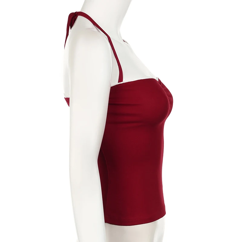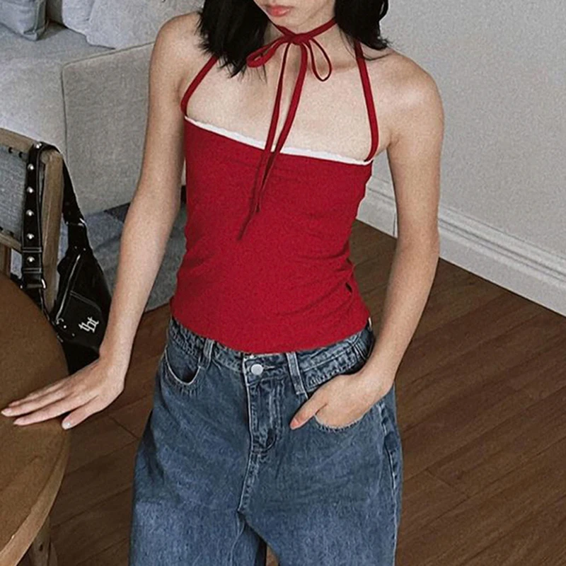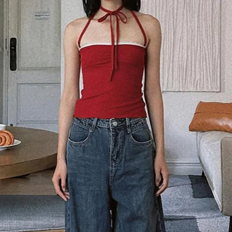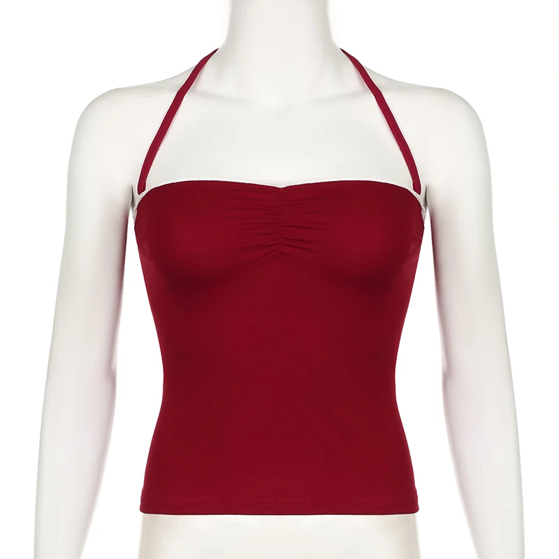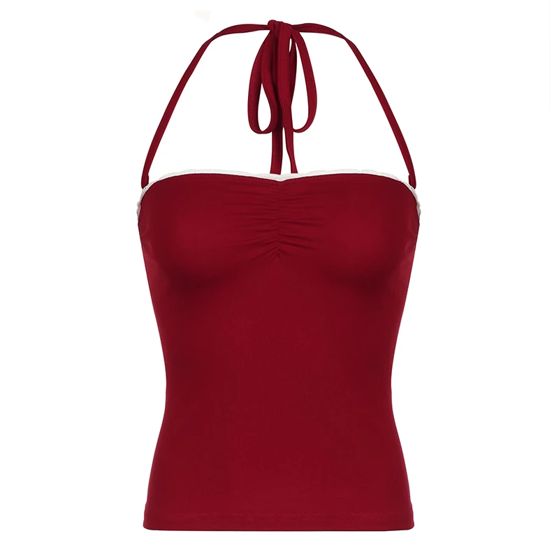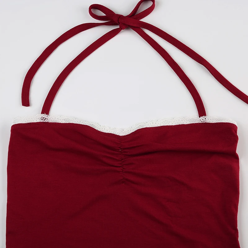 Fashion Red Lace Trim Folds Skinny Halter Top Summer Backless Off Shoulder Y2K Holidays Crop Top Sexy Women's Clothes