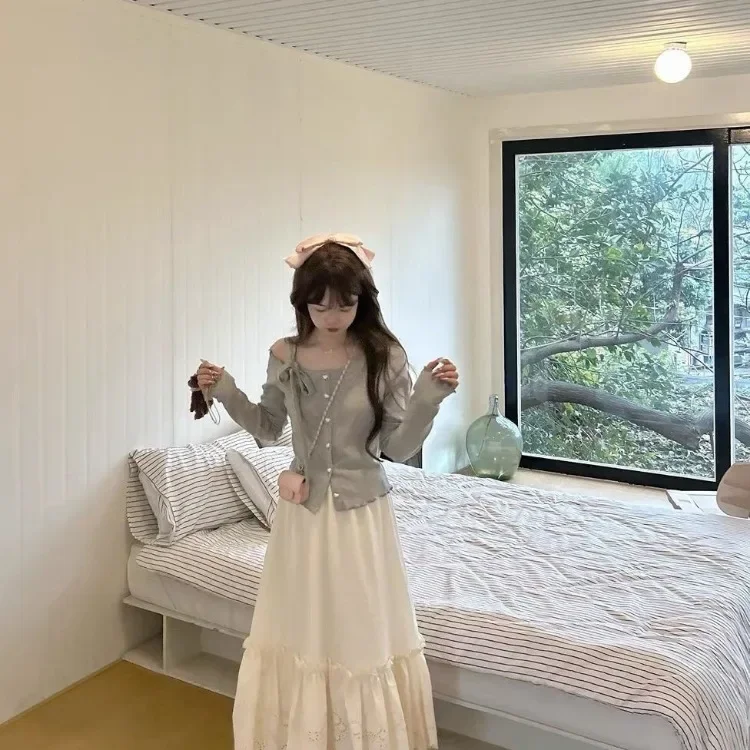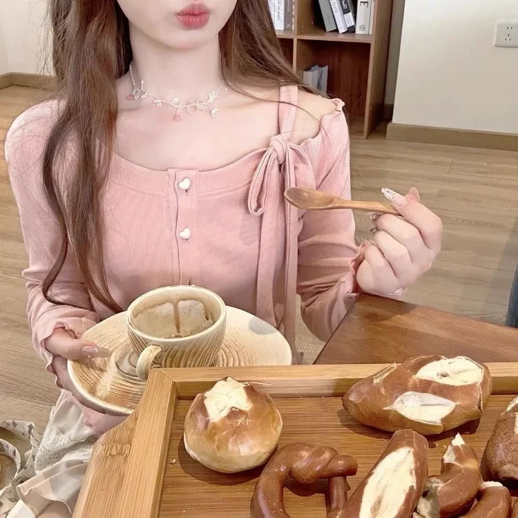 Fashion Sweet Off Shoulder Cardigan Bow Lace Up Sweaters New Slim Fit Pink Tops Women Y2k Grunge Long Sleeve Cardigan Mujer