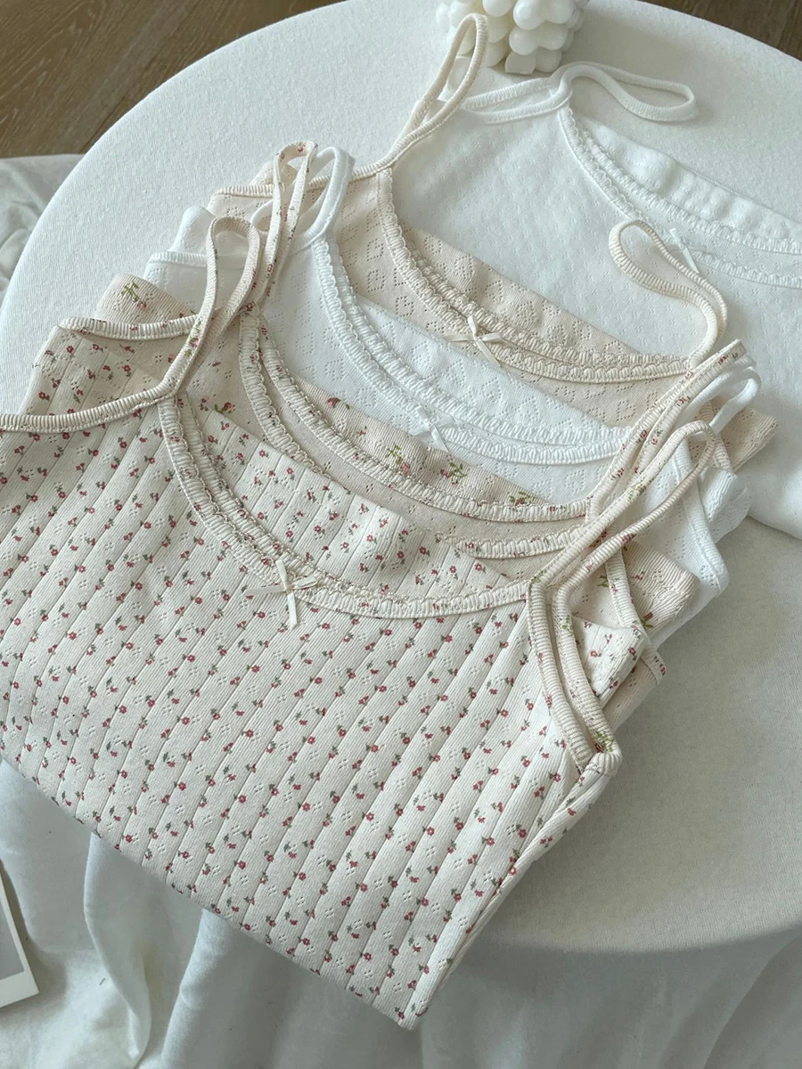 Floral Eyelet Bow Cotton Crop Tops Summer Lace Trim Sleeveless Slim Tank Top Women Preppy Style Sweet Camisole Y2k Clothes
