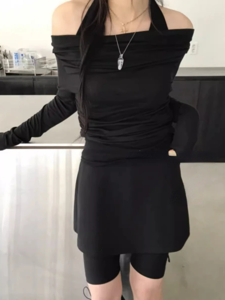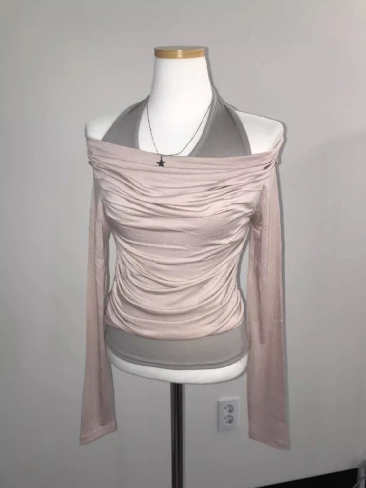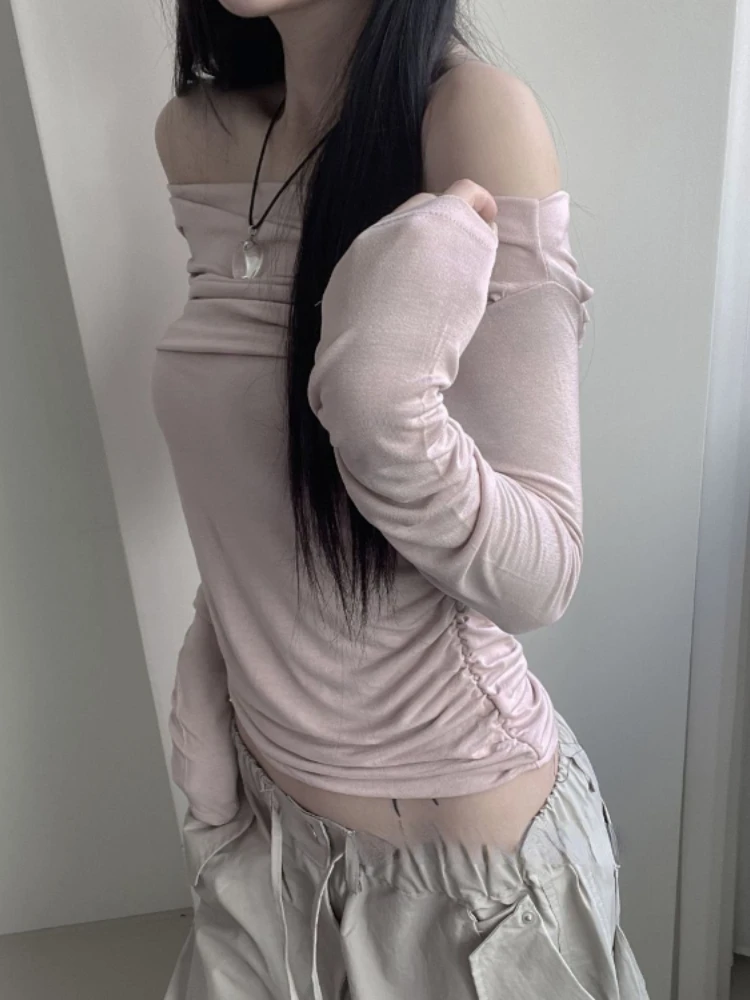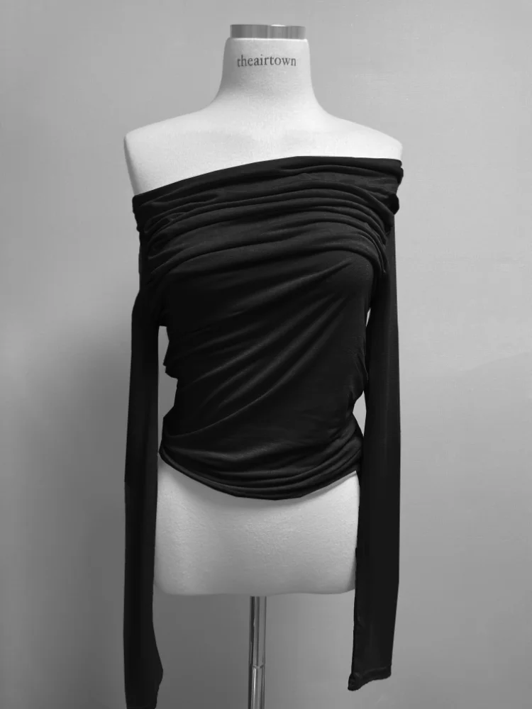 Folds T-shirt Shirts for Women Sexy Tunic Tshirts Slash Neck Long Sleeve Y2k Tops Off Shoulder Fashion T Shirts Ropa Mujer