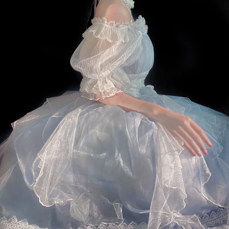 French Romantic Style Lolita Op Elegant Girl Cosplay Princess Puff Sleeve Ribbon Bowknot Flower Tunic Mesh Fantastic Fairy Dress