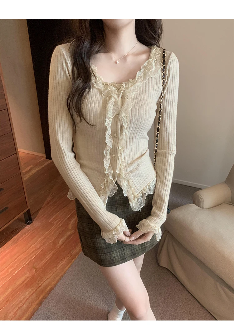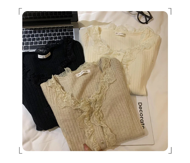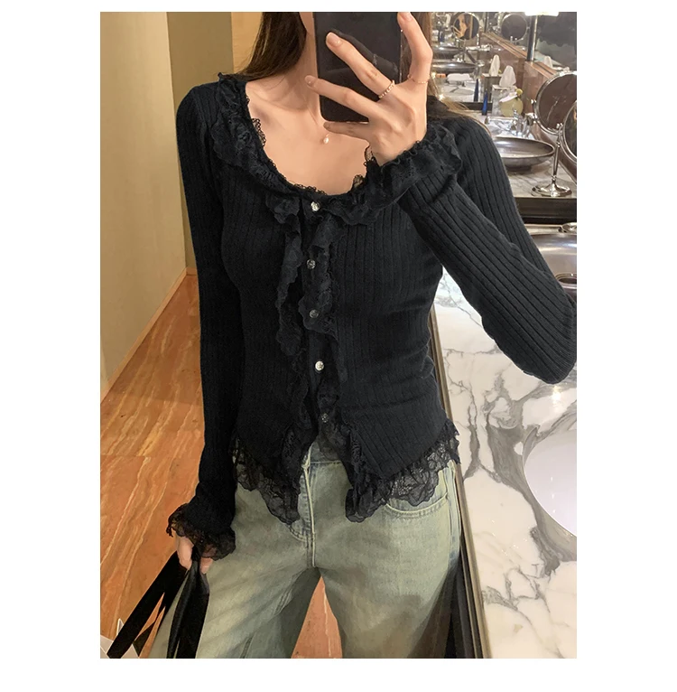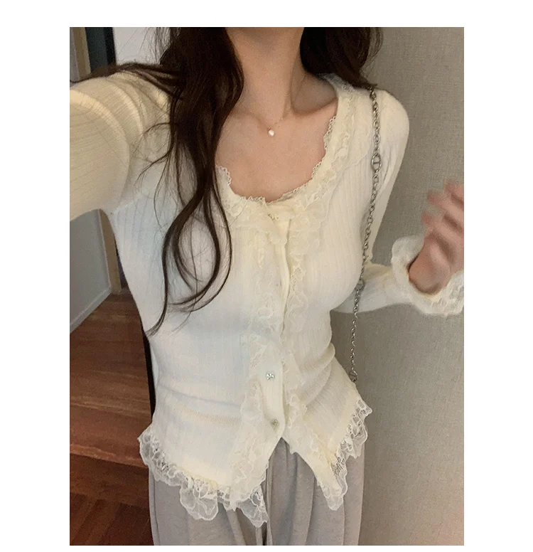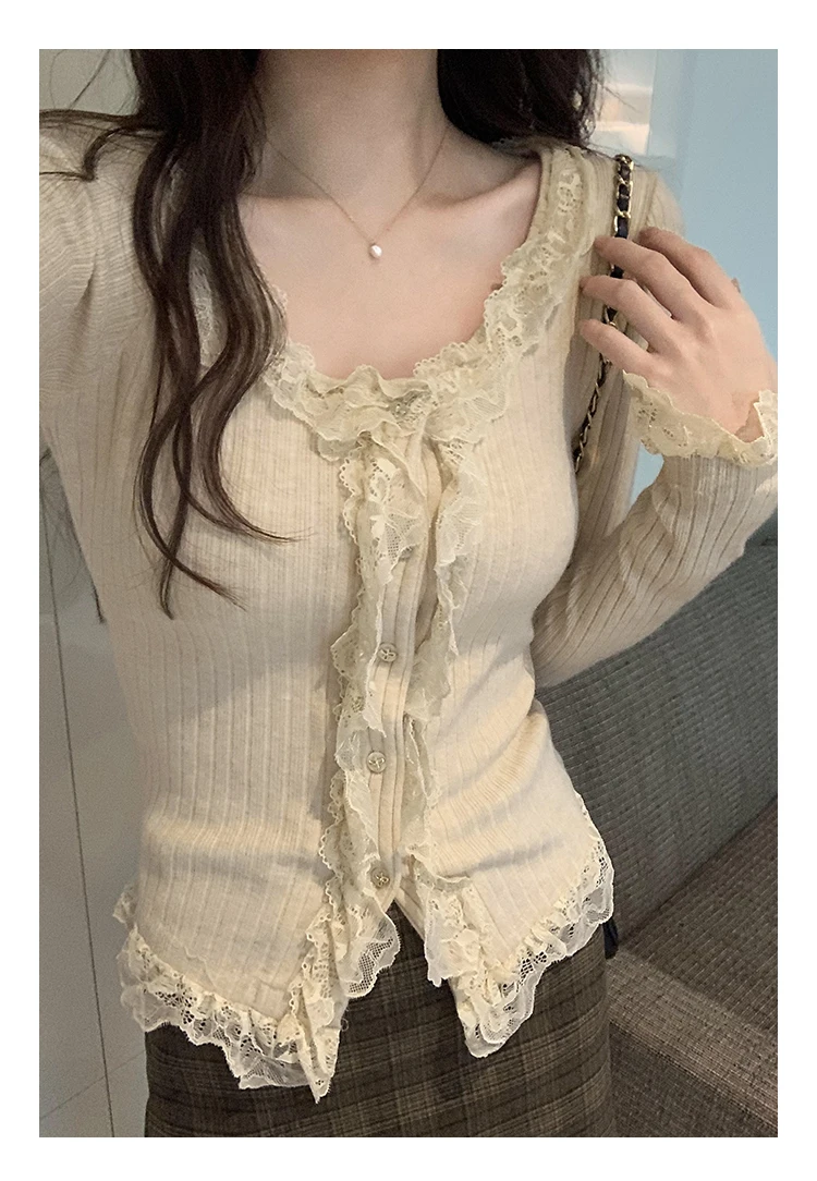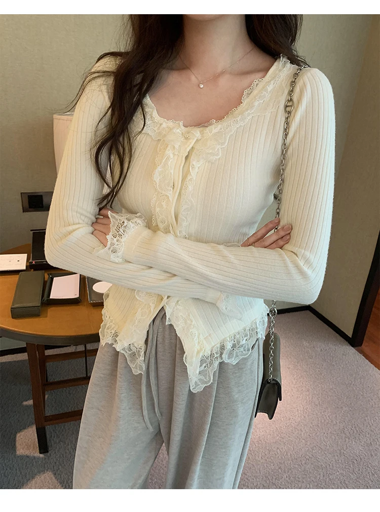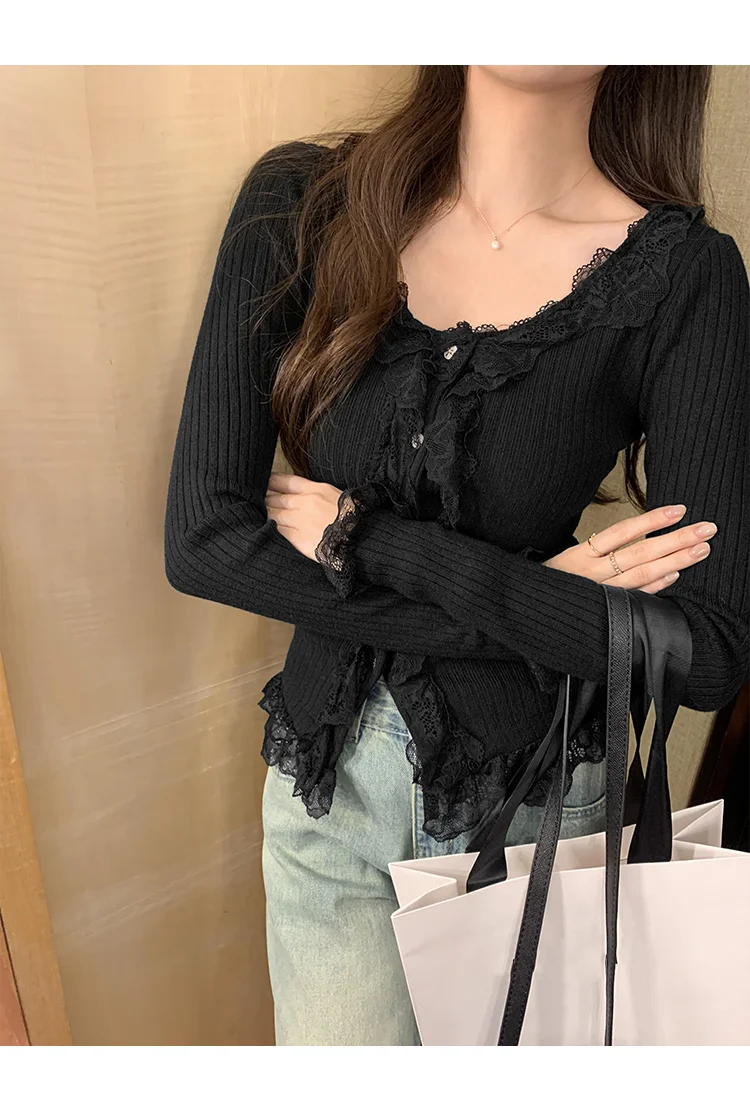French Style Elegant Lace Stitching Knitted Tops Women 2024 New Spring Fashion V-neck Long Sleeve Slim Knitting Tee Shirt