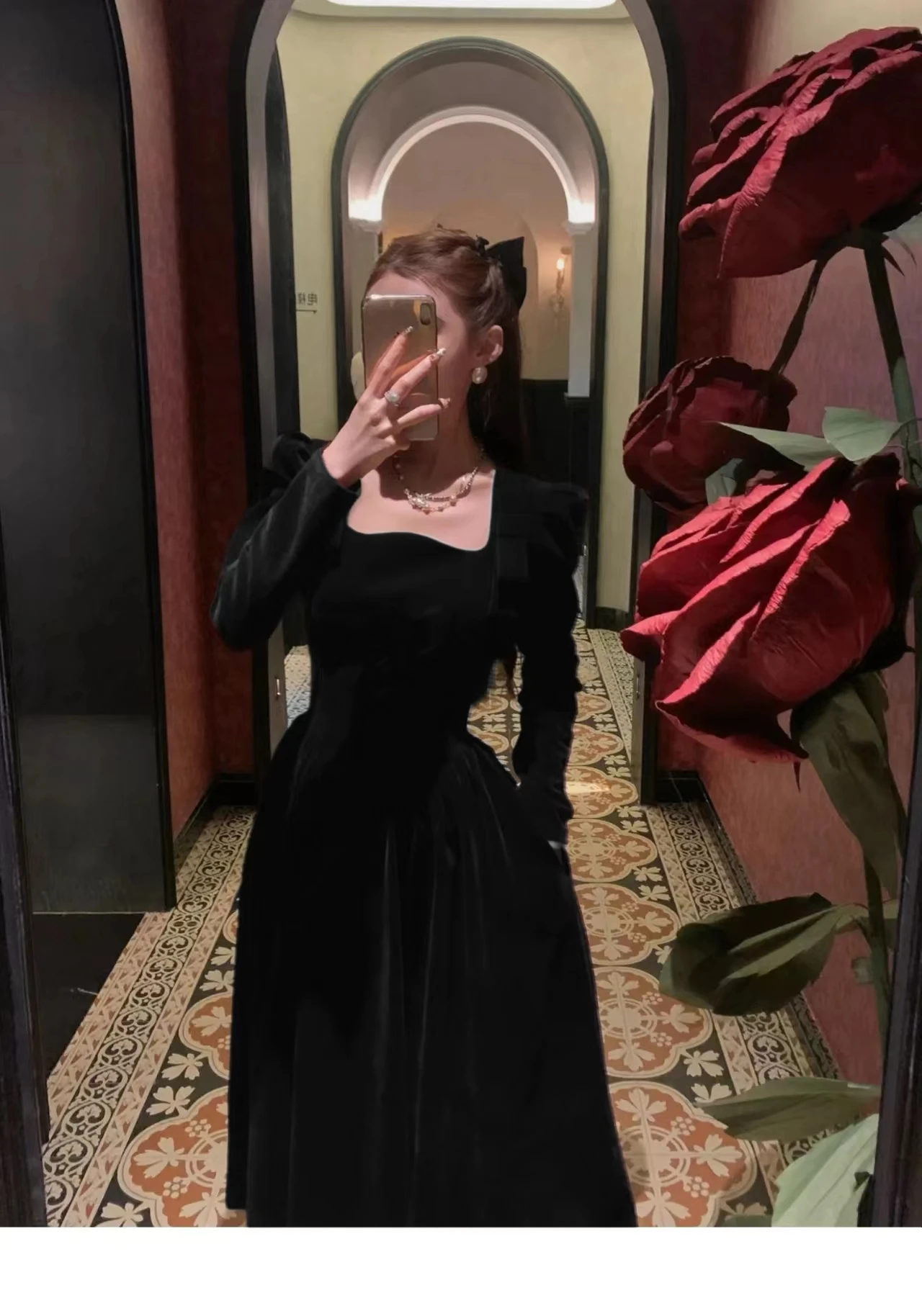 French Vintage Christmas Red Velvet Dress Square Collar Evening Party Prom Vestidos Women Elegant Autumn Winter Clothes