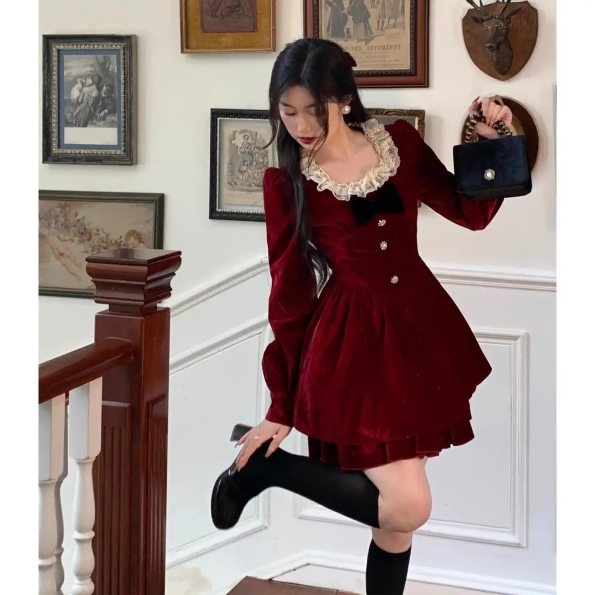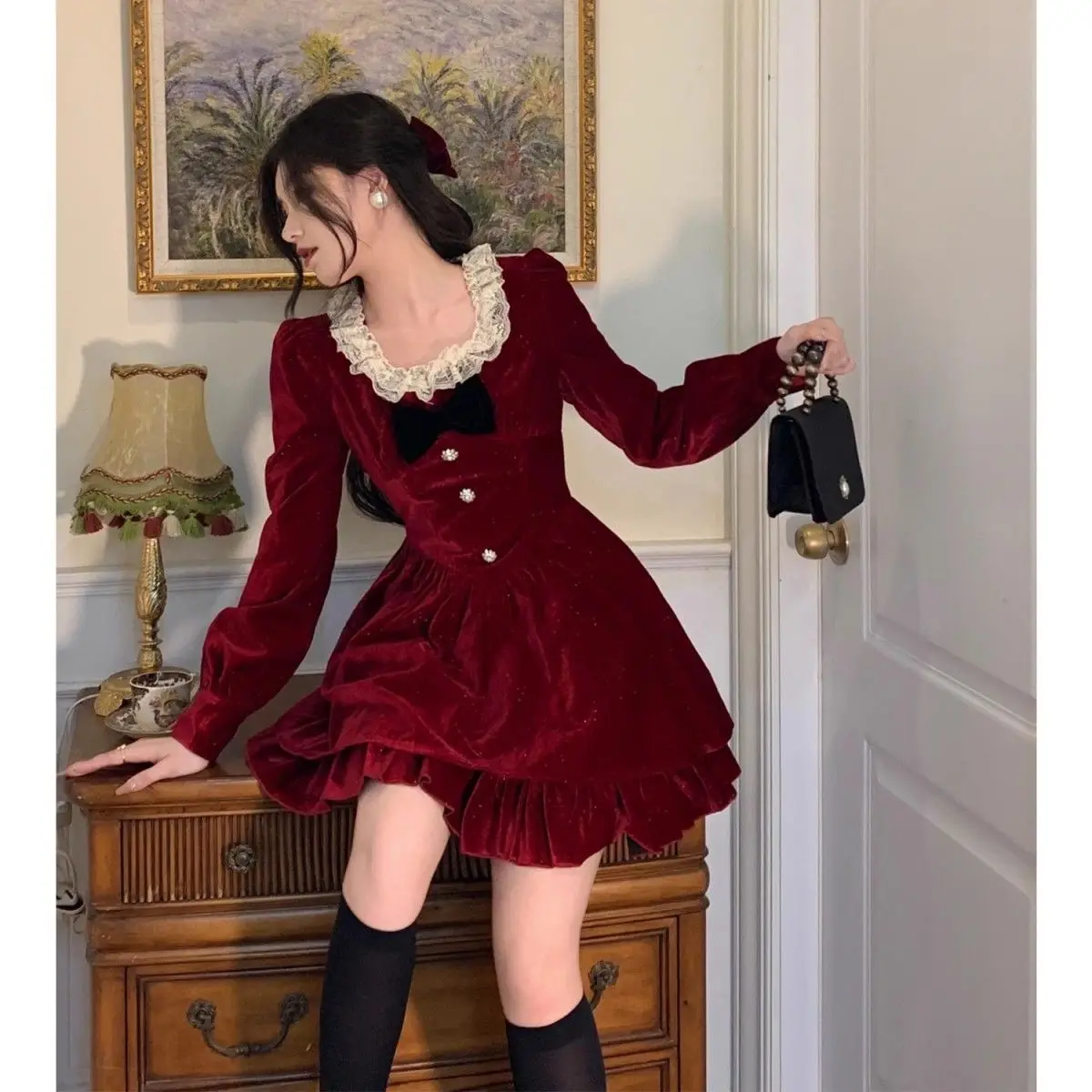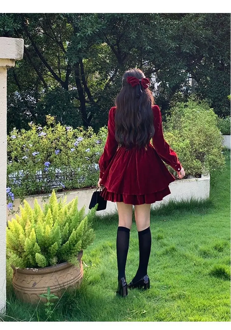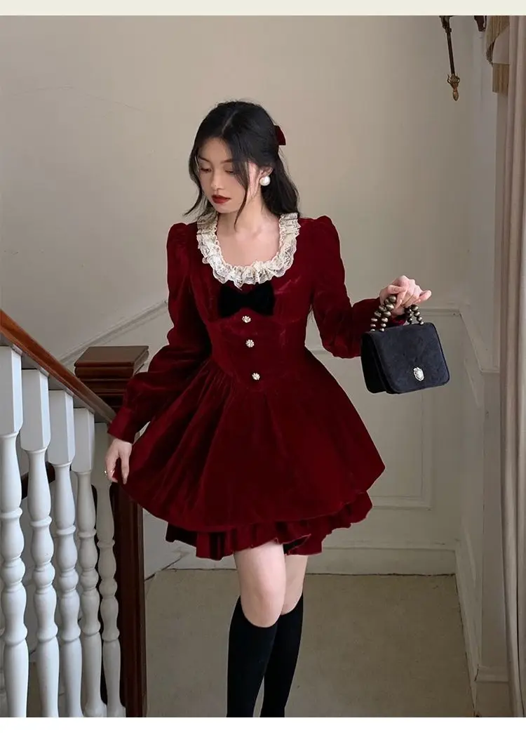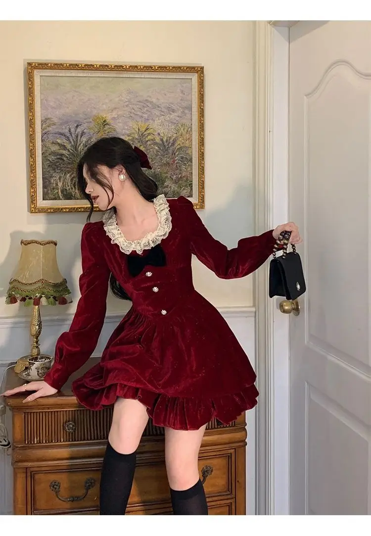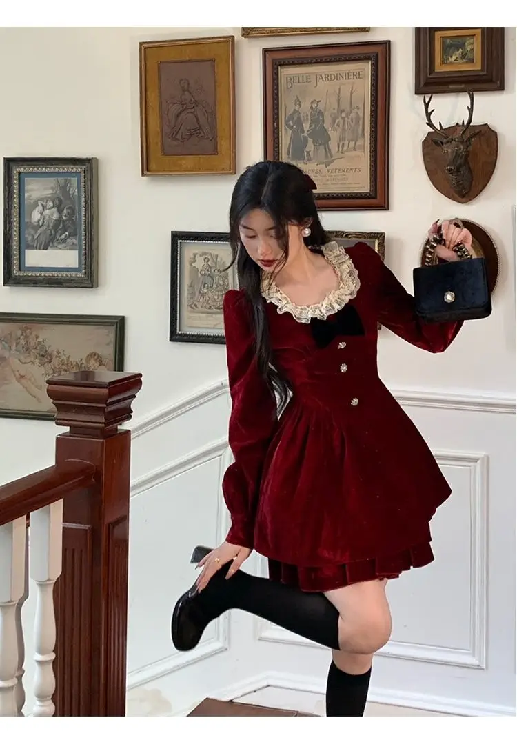Gagarich Fashion Red Velvet Dress Princess Style Palace Retro French Temperament Slimming Birthday Autumn Winter Women Vestidos