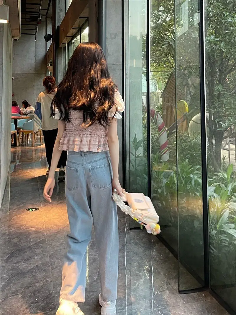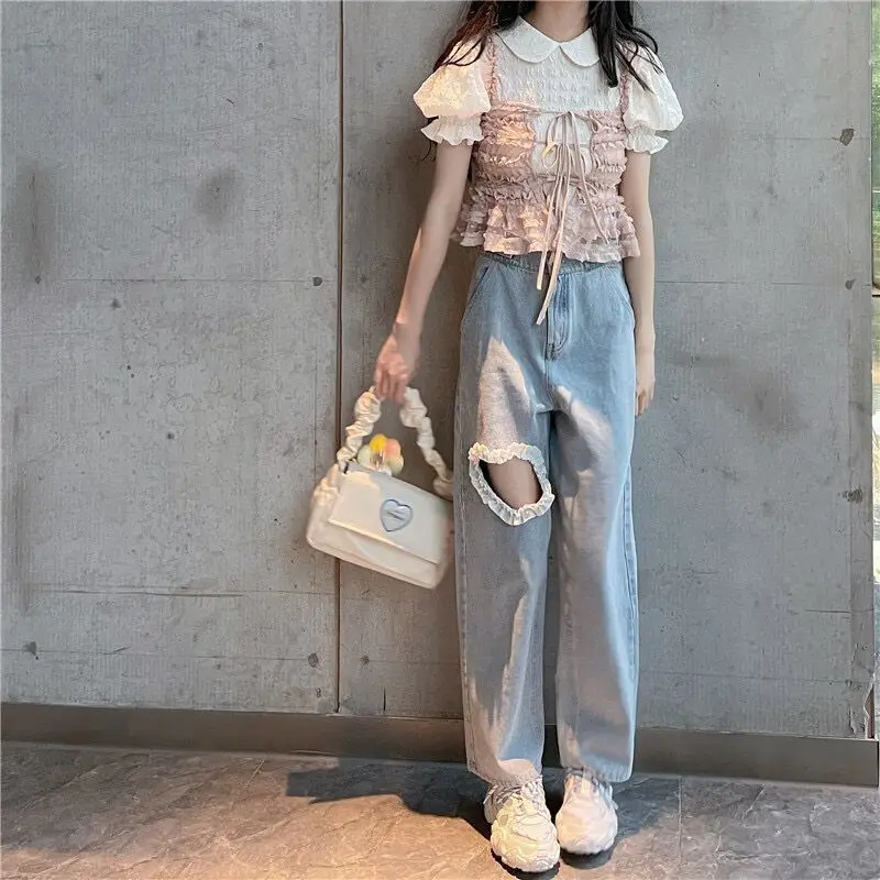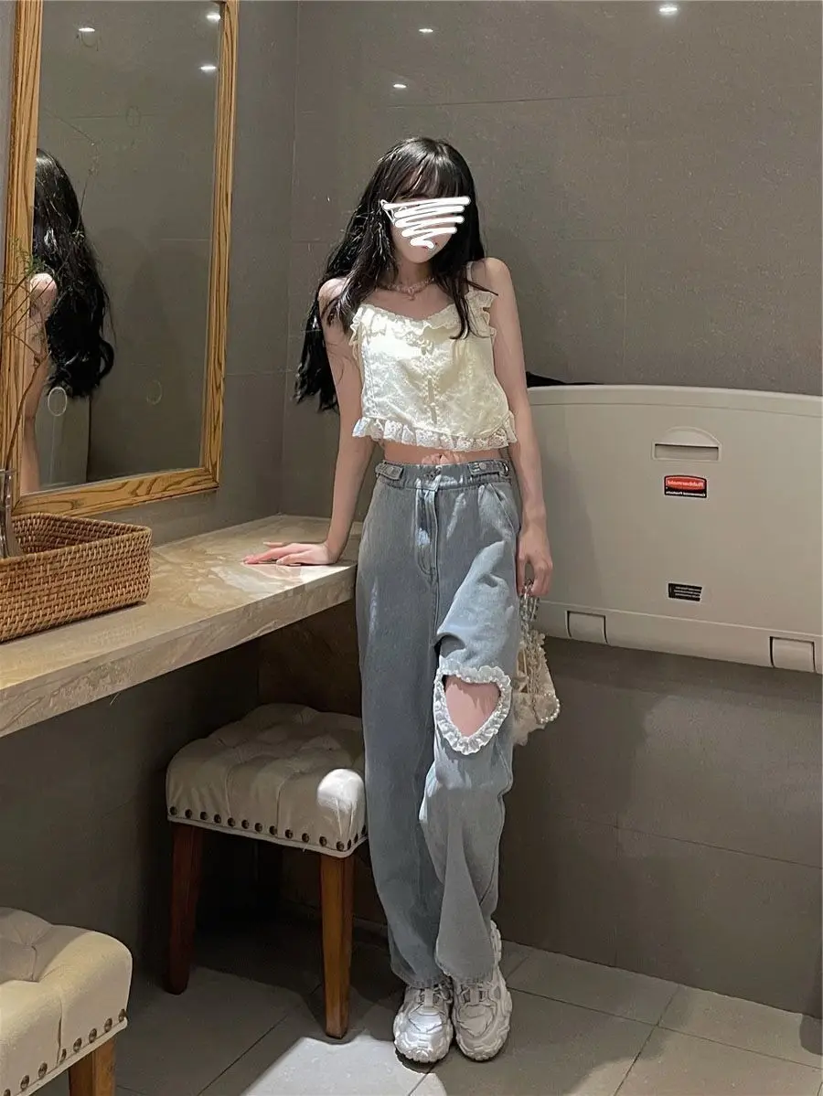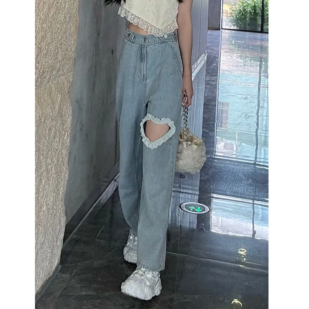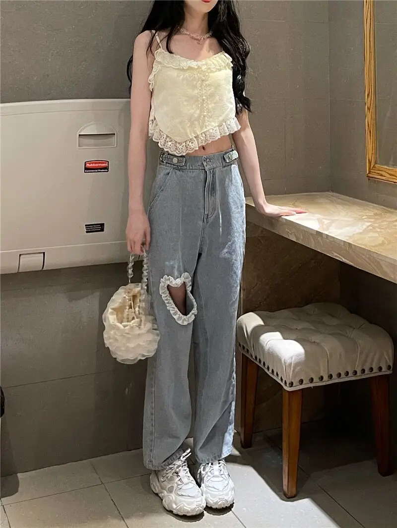 Harajuku Cyber Y2k Trousers Sweet Korean Style Kawaii Lace Stitching Jeans Women Love Hole Streetwear High-waist Wide-leg Pants