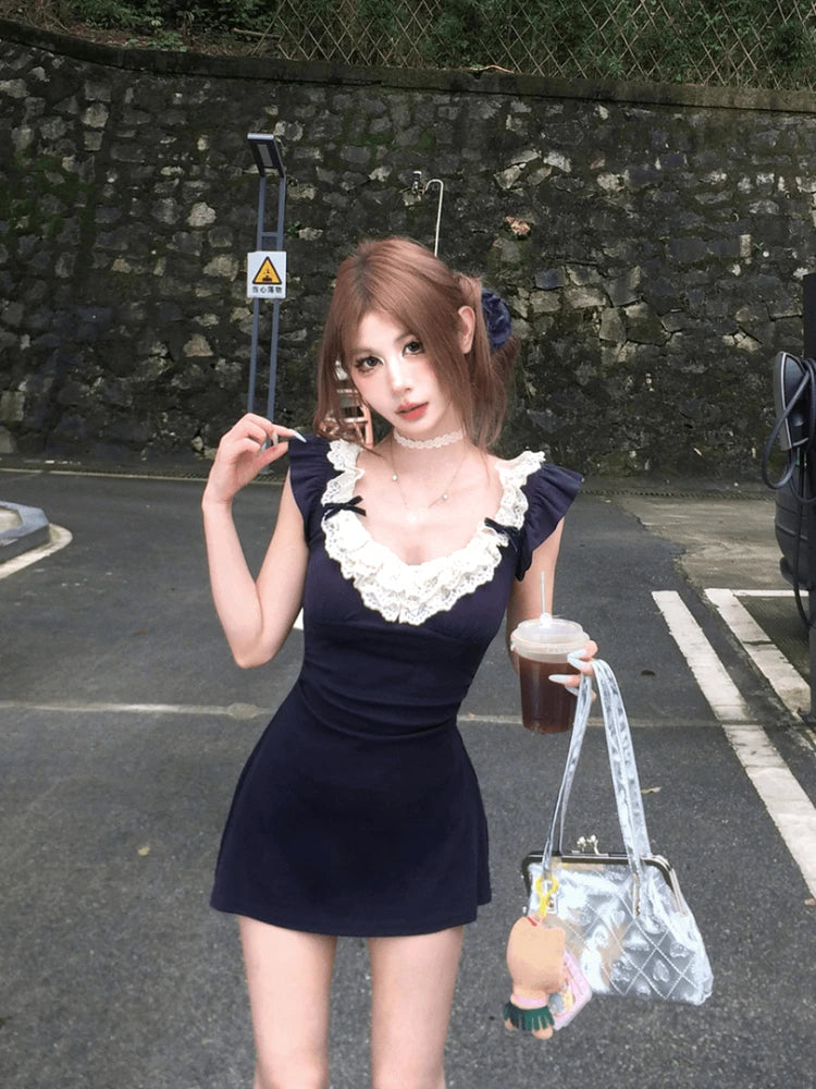 Hnewly 2000s Vintage Lace Patchwork Mini Dress Women Sexy Bow Lace-up Sleeveless Dress One Piece Korean Fashion Clothing Summer 2024