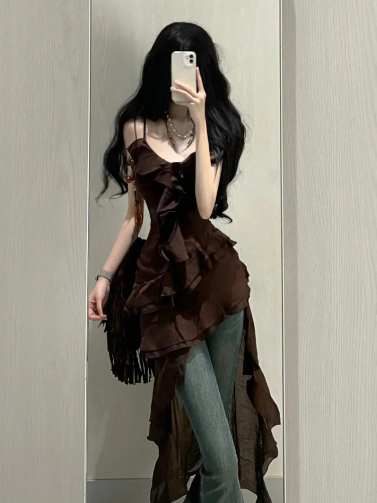Hnewly 2000s Y2k Vintage 2 Piece Pant Sets Women Casual Blouse Dress Tank Top +denim Pants Summer Beach Irregular Korean Suits Chic