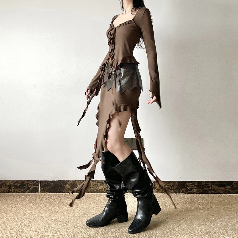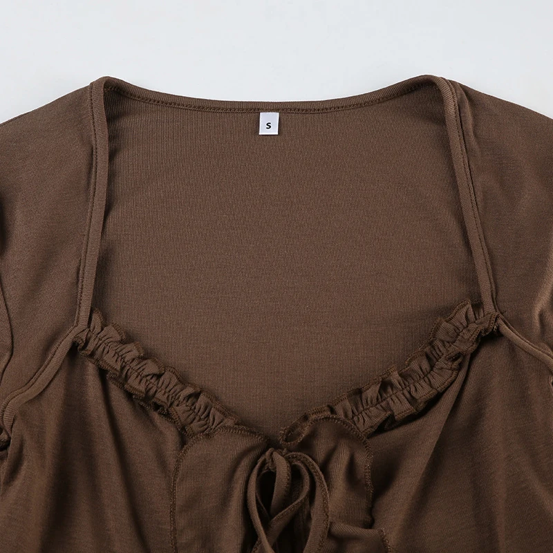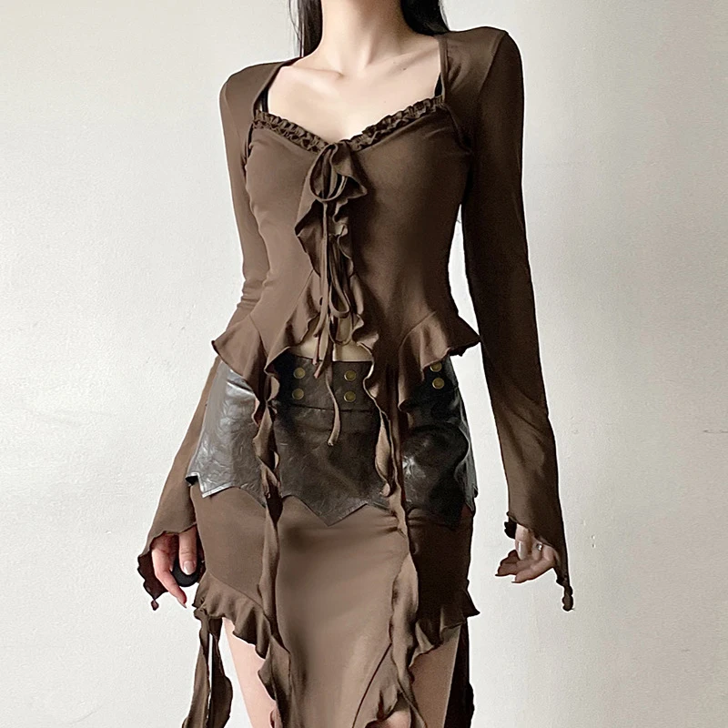 Solid color, front tie closure, sweetheart v-neck, long sleeves, irregular ruffles, slim fit, crop length; Fitted crop tops for women; Dressy crop tops for women; Ruffles tops for women, makes you more attractive