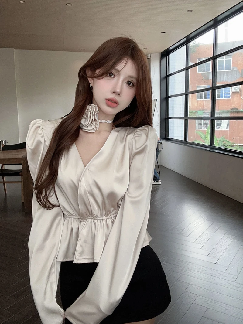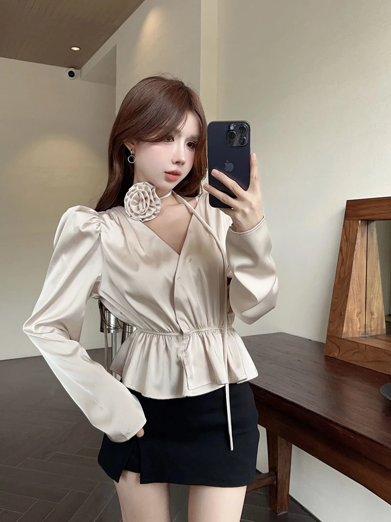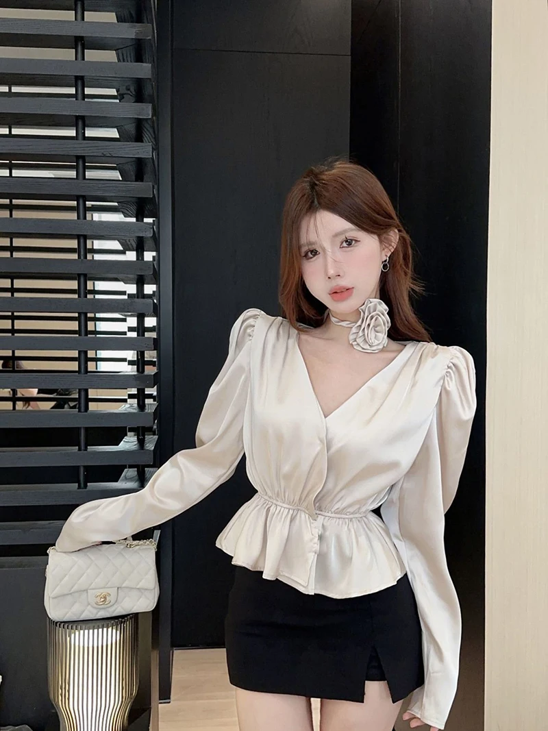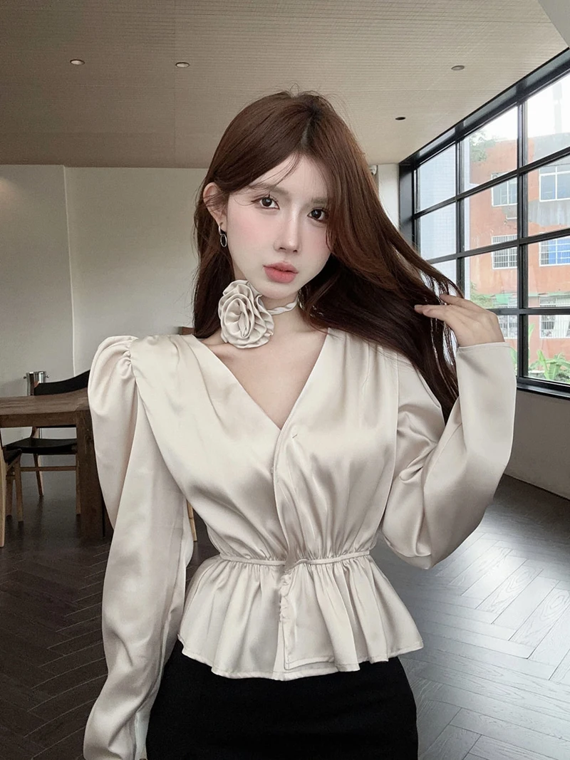 Hnewly 3D Floral Satin Shirt Women Long Sleeve Elegant Vintage Blouse Korean Casual Sexy V Neck Slim Female Champagne Tops Spring