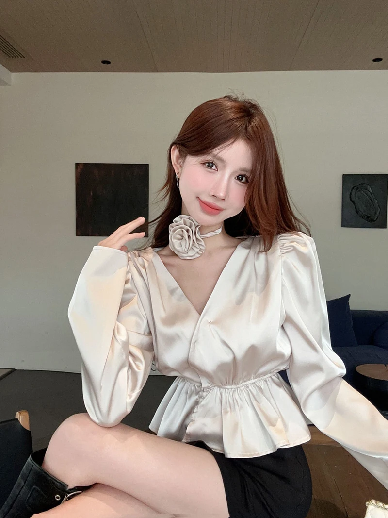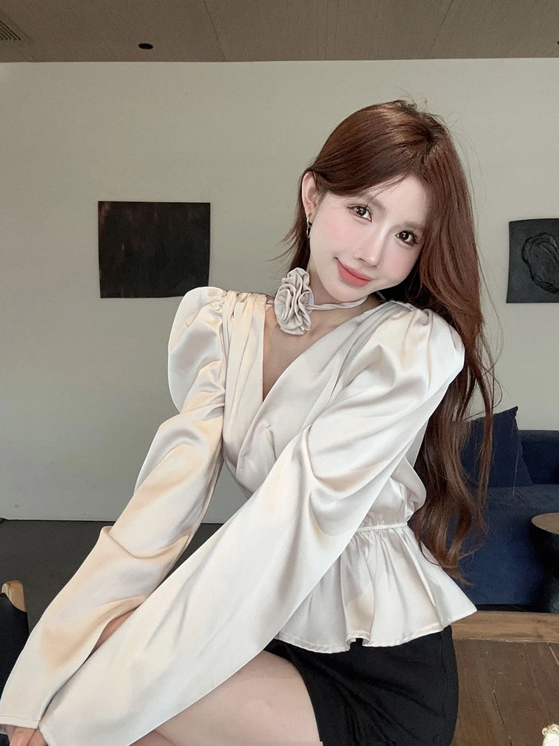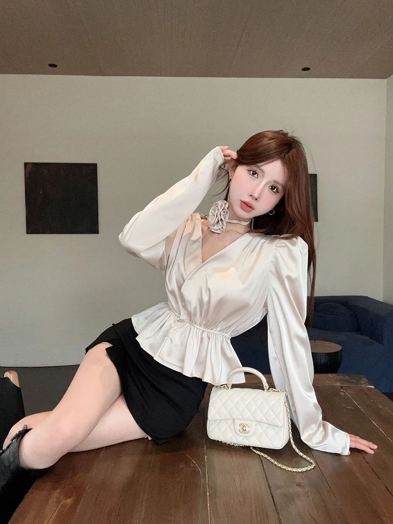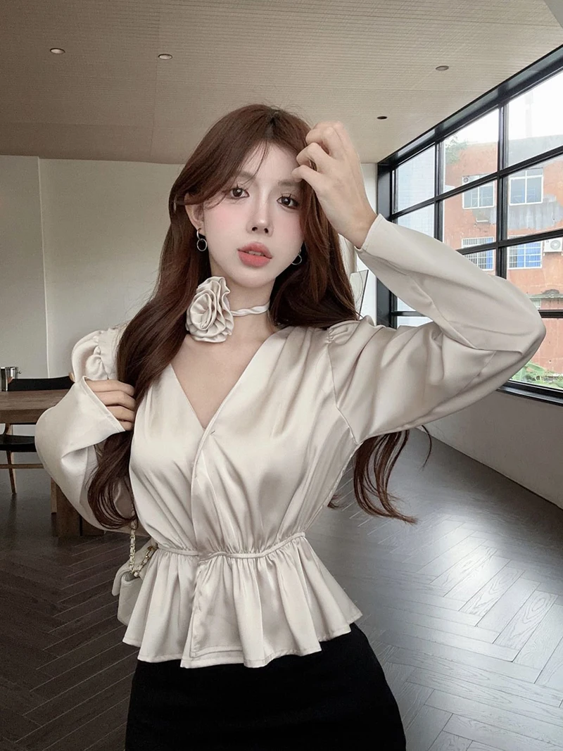 Hnewly 3D Floral Satin Shirt Women Long Sleeve Elegant Vintage Blouse Korean Casual Sexy V Neck Slim Female Champagne Tops Spring
