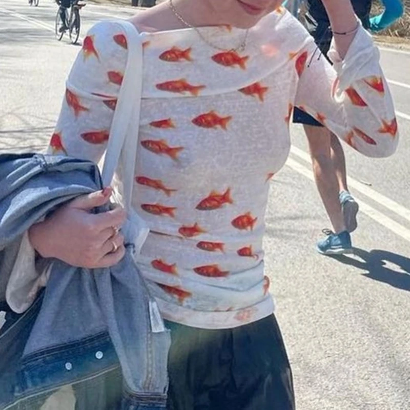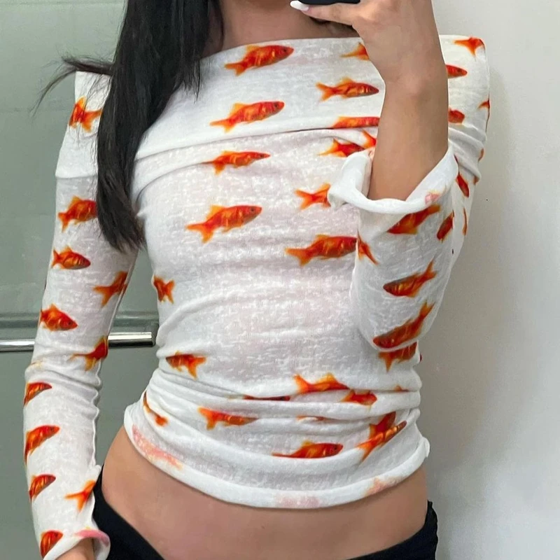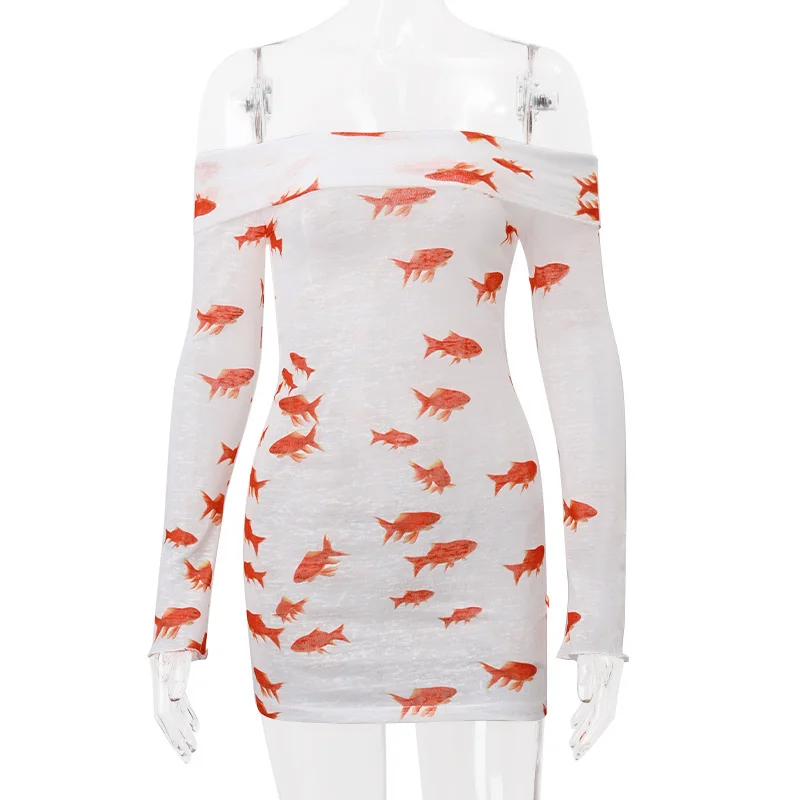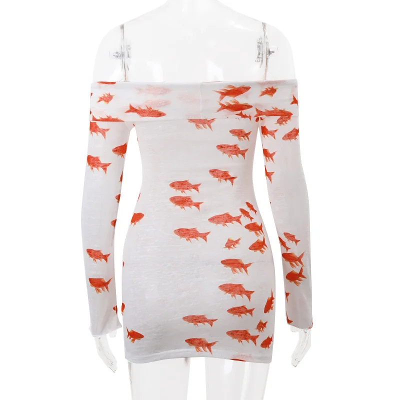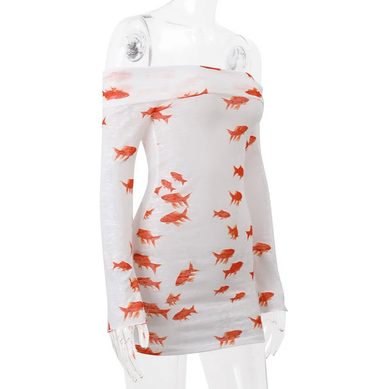 Hnewly Aesthetic Slash-neck Goldfish Print Dress Elegant Off Shoulder Long Sleeve Dresses Daily Women's Skinny Party Vestidos