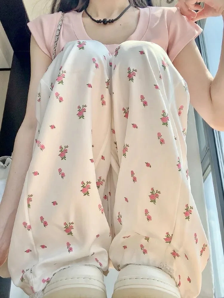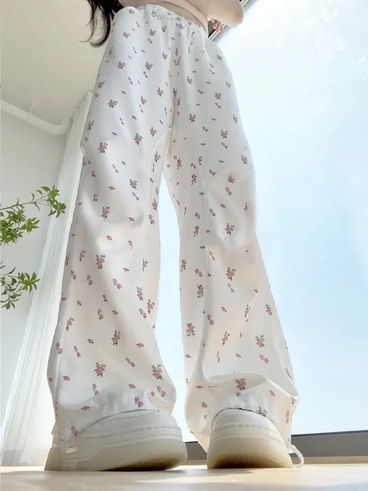 Hnewly American Casual White Flower Print Cargo Pants Autumn New High Waist Y2k E-Girl Straight Wide Leg Women