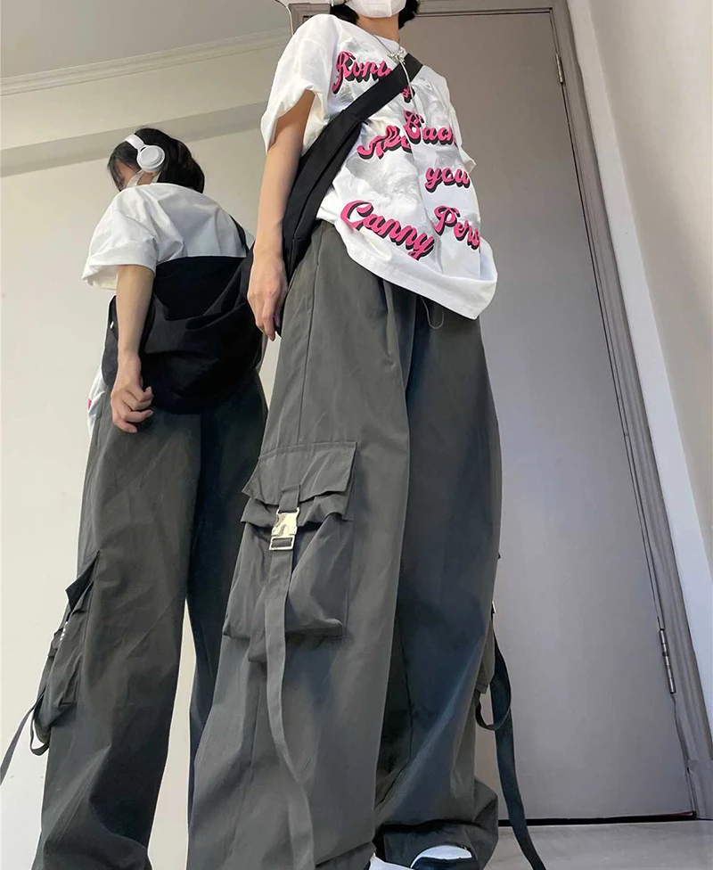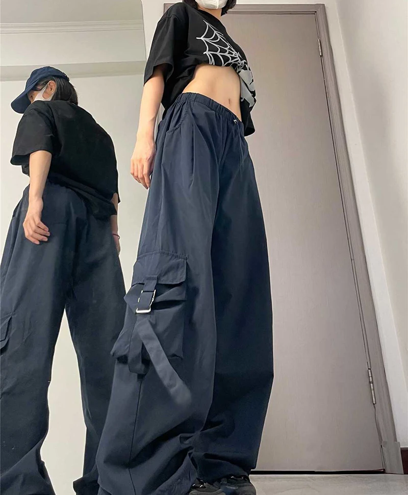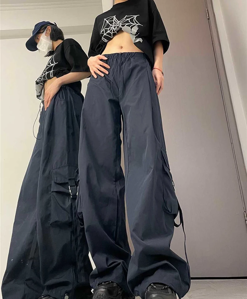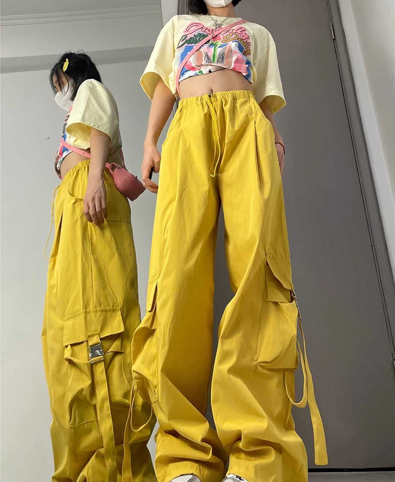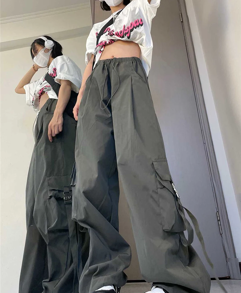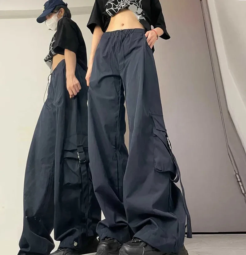 Hnewly American Drawstring Hiphop Cargo Pants Women Loose Lazy Jazz Dance Big Pocket Trousers High Waist Solid Streetwear Wide Leg Pant