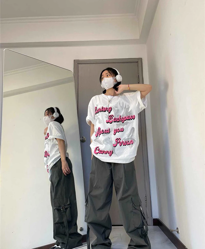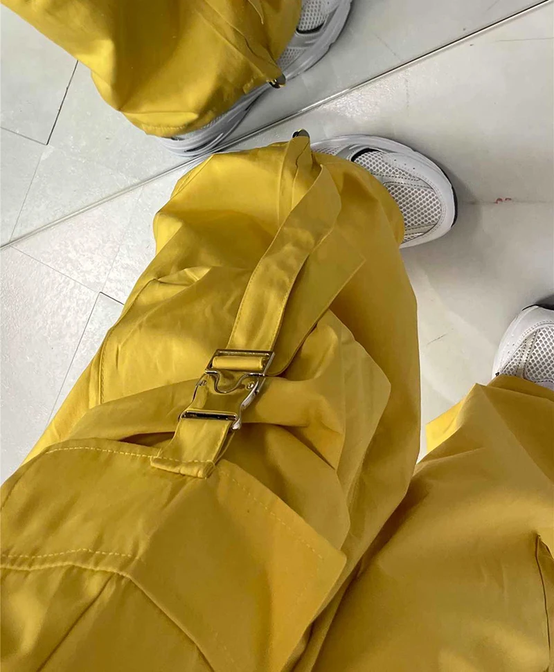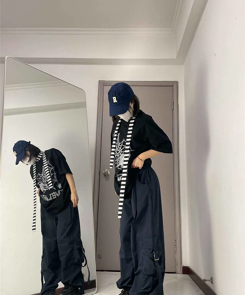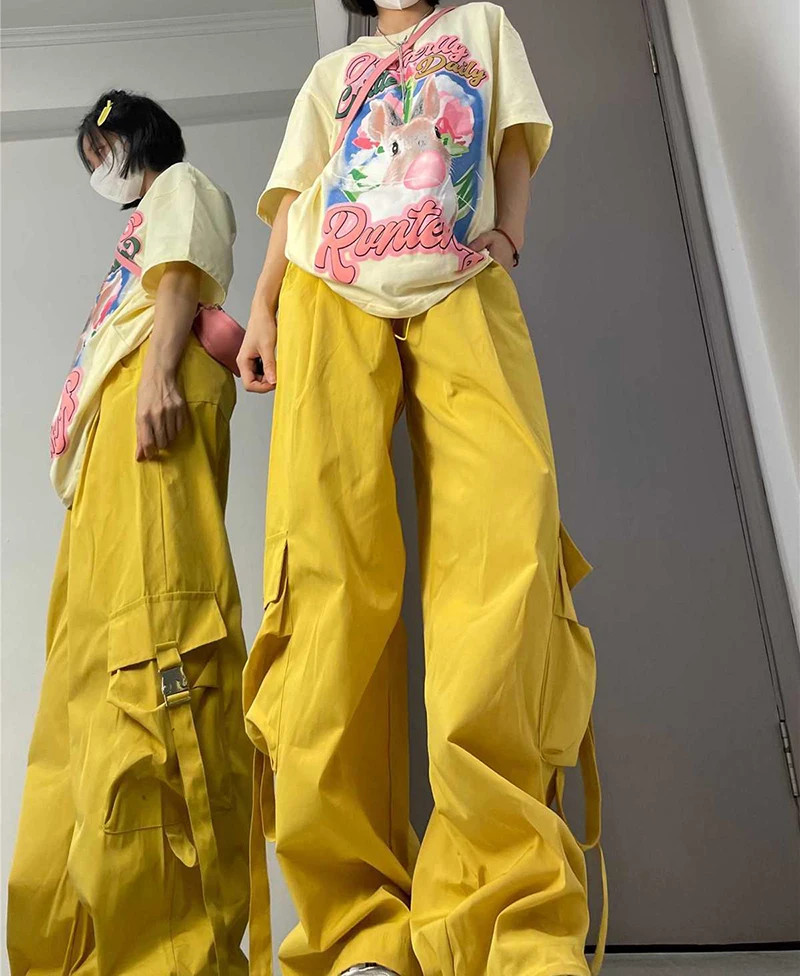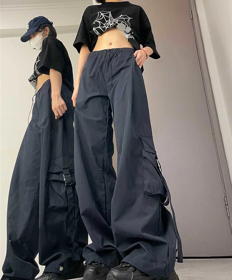 Hnewly American Drawstring Hiphop Cargo Pants Women Loose Lazy Jazz Dance Big Pocket Trousers High Waist Solid Streetwear Wide Leg Pant