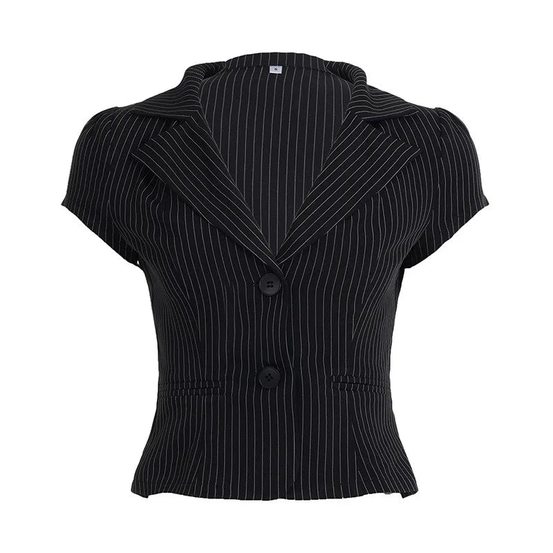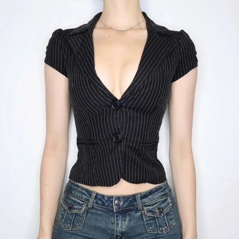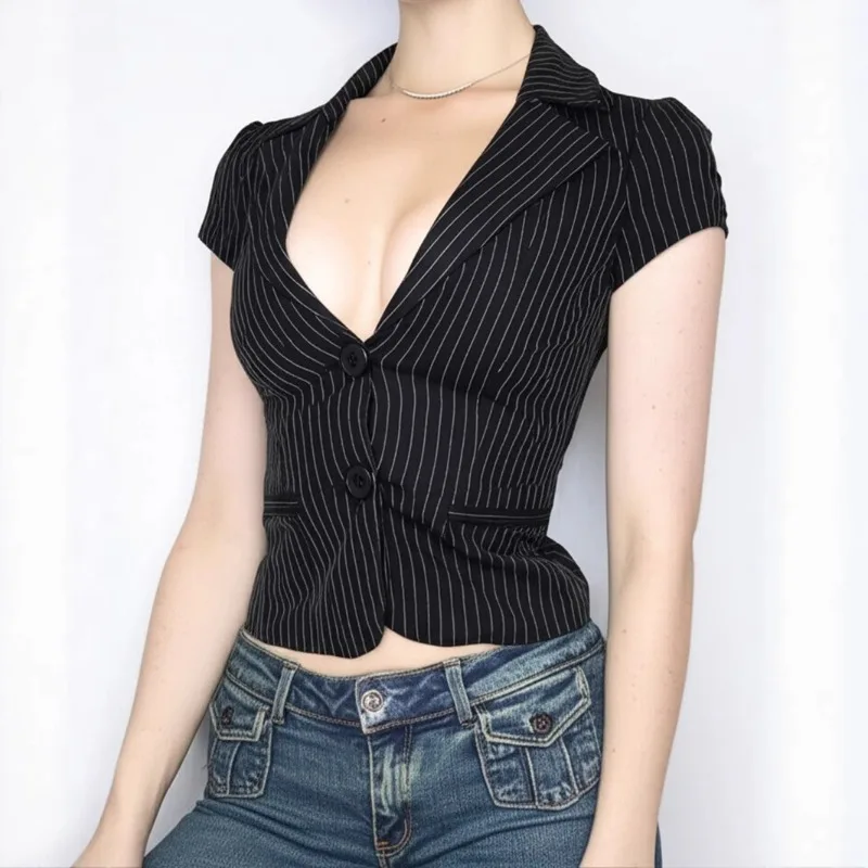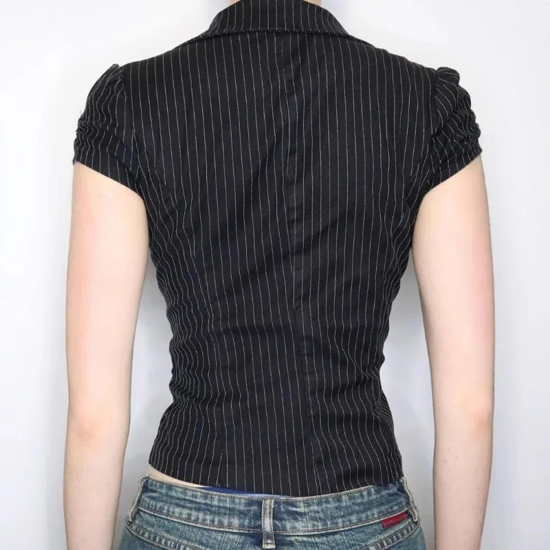 Hnewly American Sexy V-neck All-match Striped Shirt Women New Slim Waist Blouses Summer Short Sleeve Black Blusas De Mujer