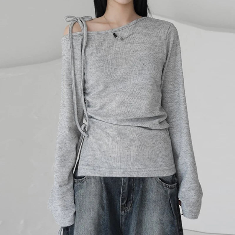 Hnewly Asymmetrical Off-shoulder Crop Top Grey Bandage Drawstring Long Sleeve Knitted T Shirts Korean Fashion Casual Tees Women