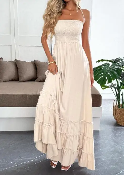 Hnewly Autumn and Winter Women's Elegant Vacation Style Strapless Neck Hanging Suspender Ruffle Stylish Long Dress