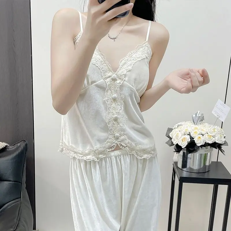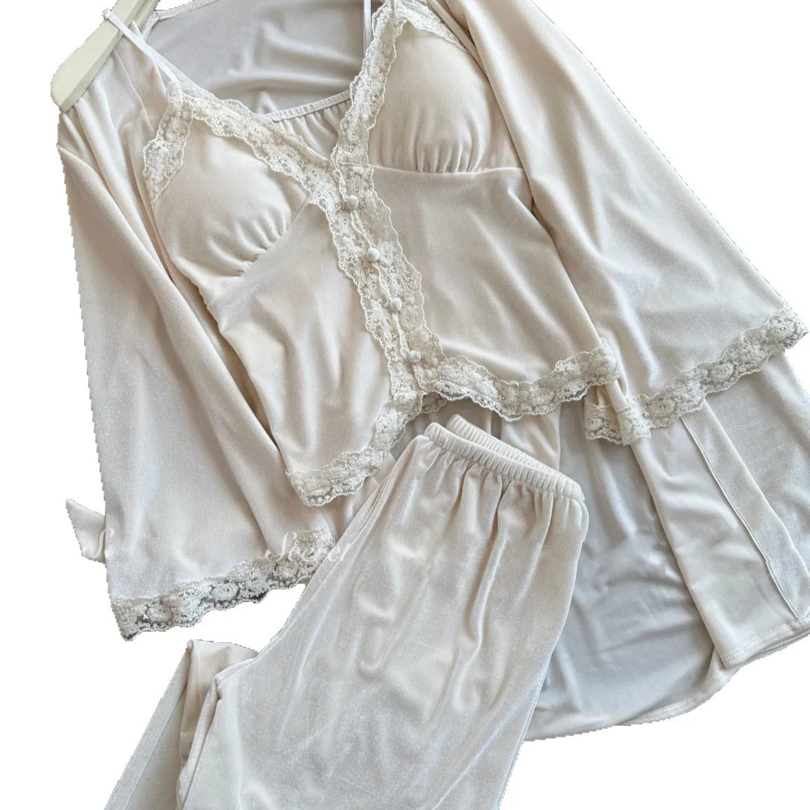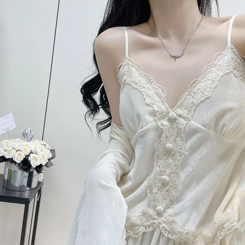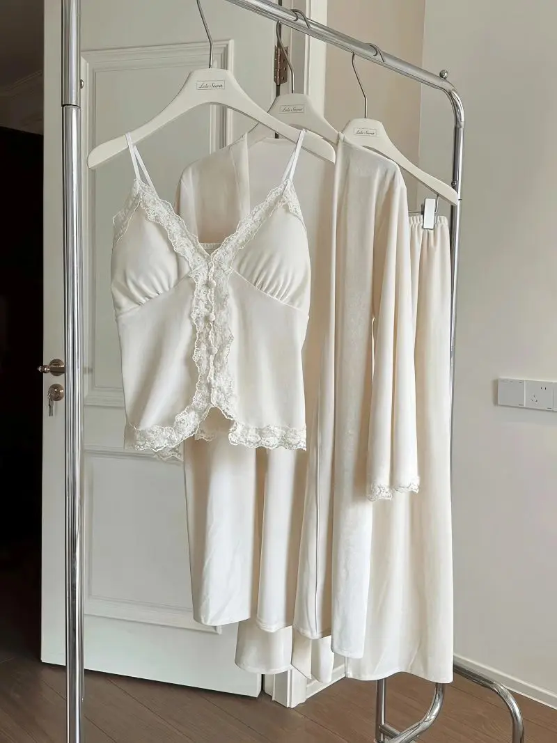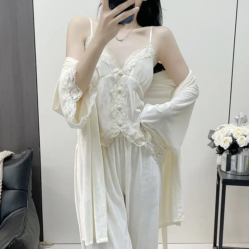 Hnewly Autumn Winter Velvet Sleepwear Women's Strap Long Pants Three-piece Set Sexy Solid Color with Chest Pad Home Clothes