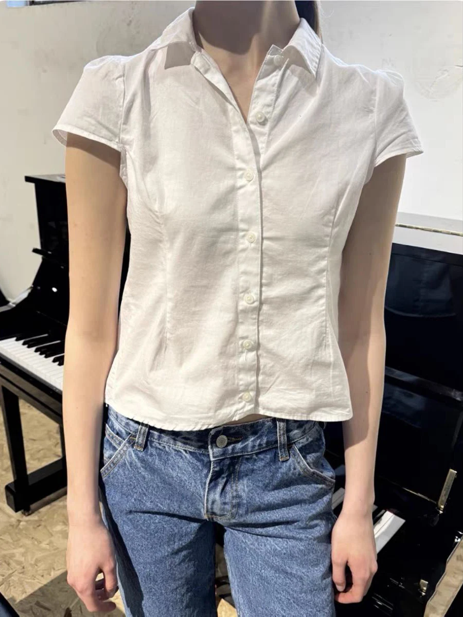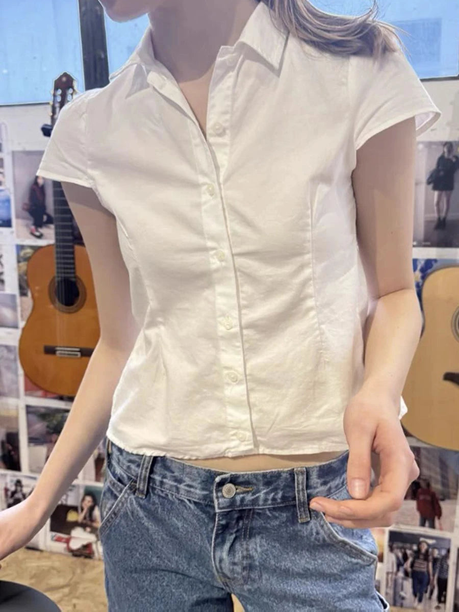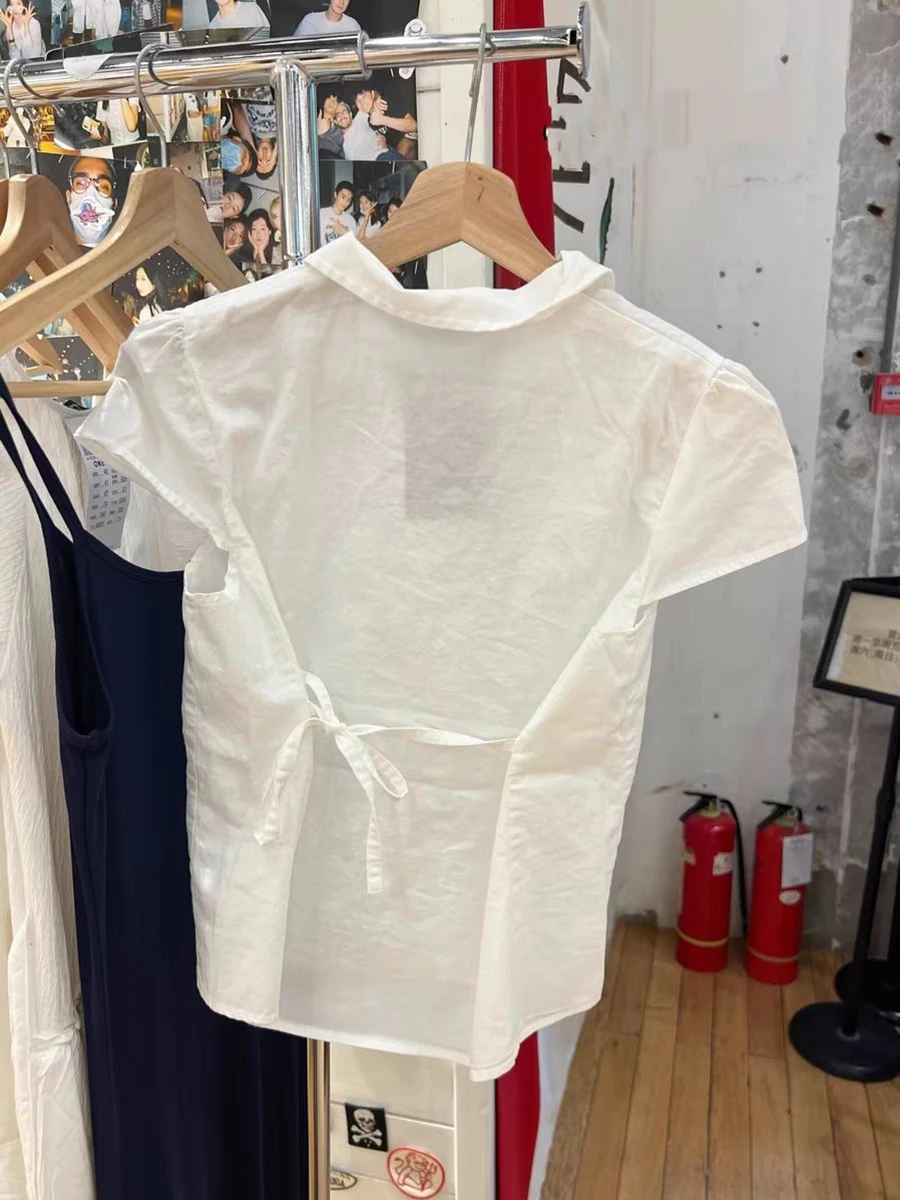 Hnewly Back Lace-up White Blouse T-Shirt Woman Summer Peter pan Collar Short Sleeve Slim Tee Shirt Casual Cute Cotton Sweet Crop Tops