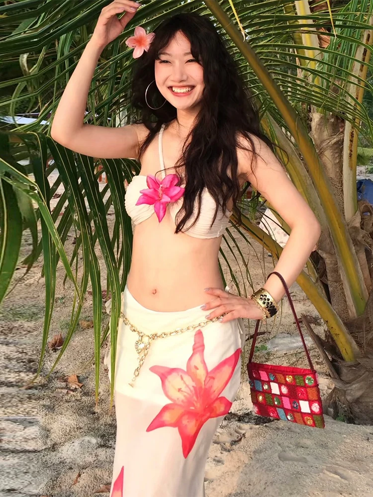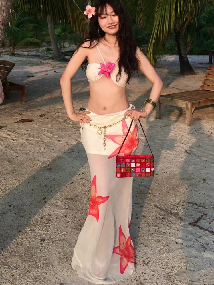 Hnewly Beach Party 2-Piece Set Women Y2K Halter 3d Flowers Bra+Flower Print Mesh Lace-Up Skirts Matching Summer Trend Suit