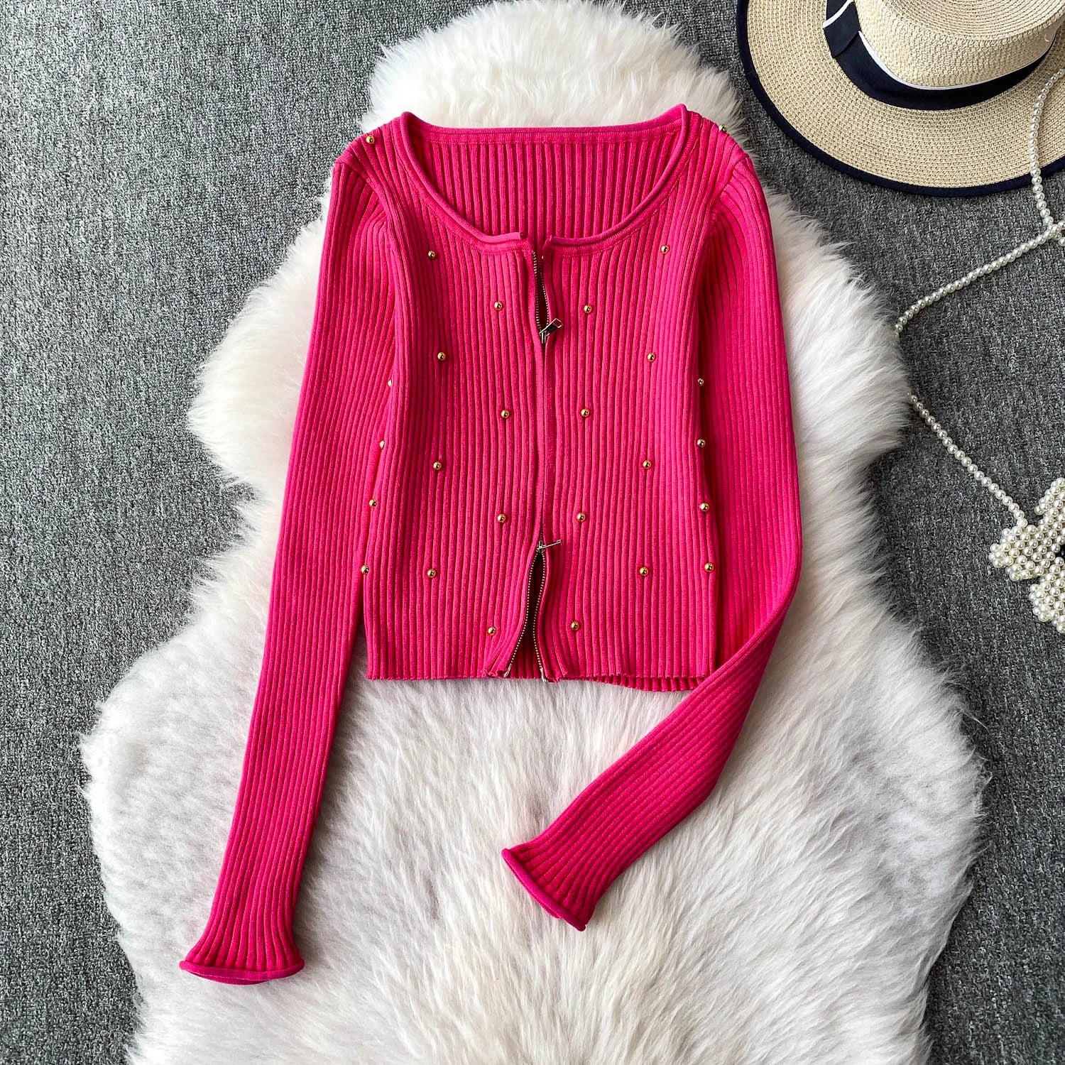 Hnewly Beading Knitted Striped Zippered Sweater Cardigan Women's Spring Autumn O-Neck Top New Loose Harajuku Long Sleeved Outwear