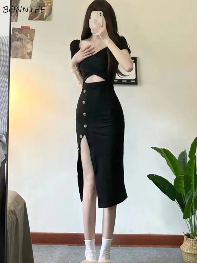 Hnewly Black Dress Women Irregular Slit Hotsweet Summer Hollow Out Elegant Bodycon Party Fashion Streetwear Daily All-match Vacation