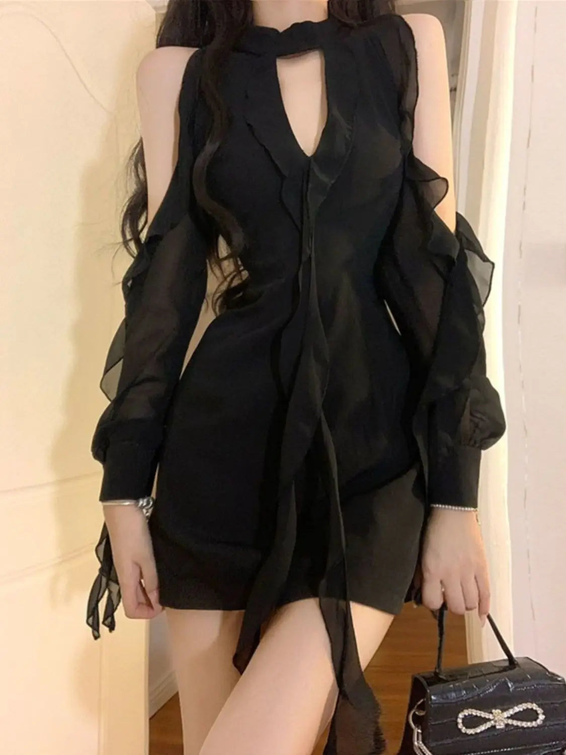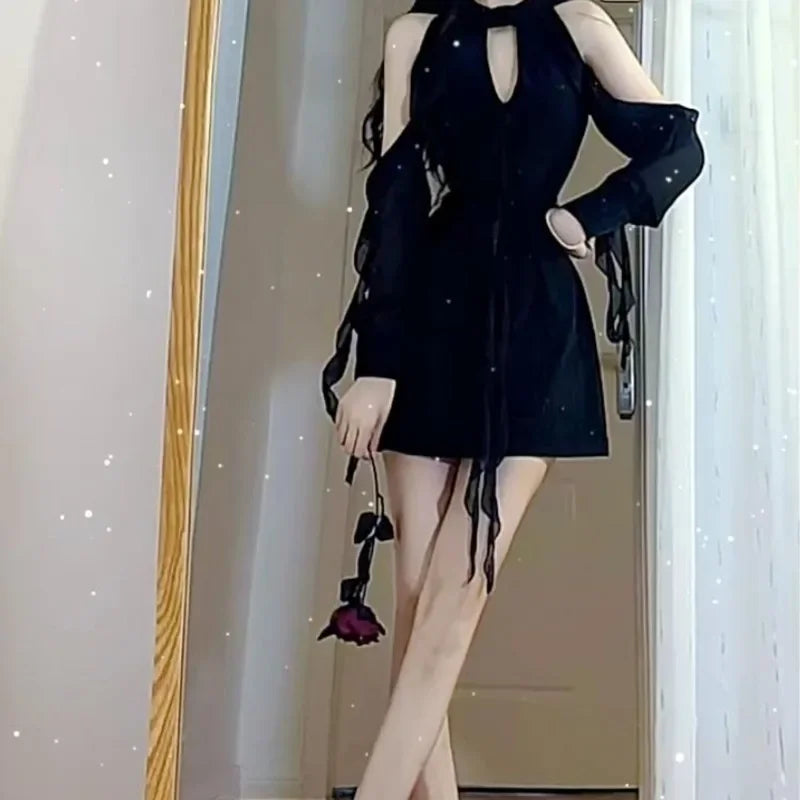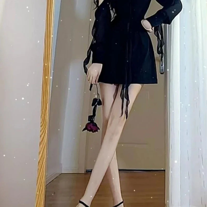 Hnewly Black Sexy Chiffon Dress Women Elegant Ruffle Mesh Mini One-piece Dress Fairycore Sweet Luxury Bodycon Korean Style