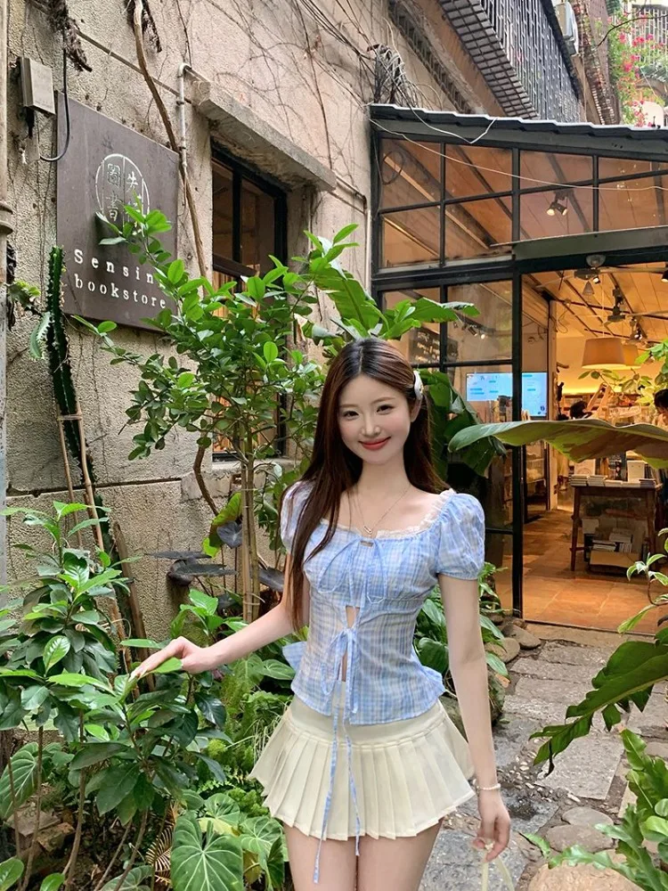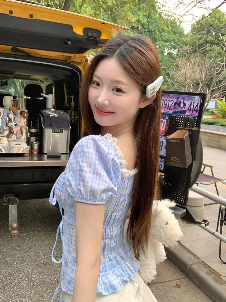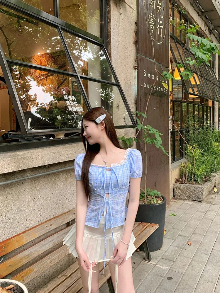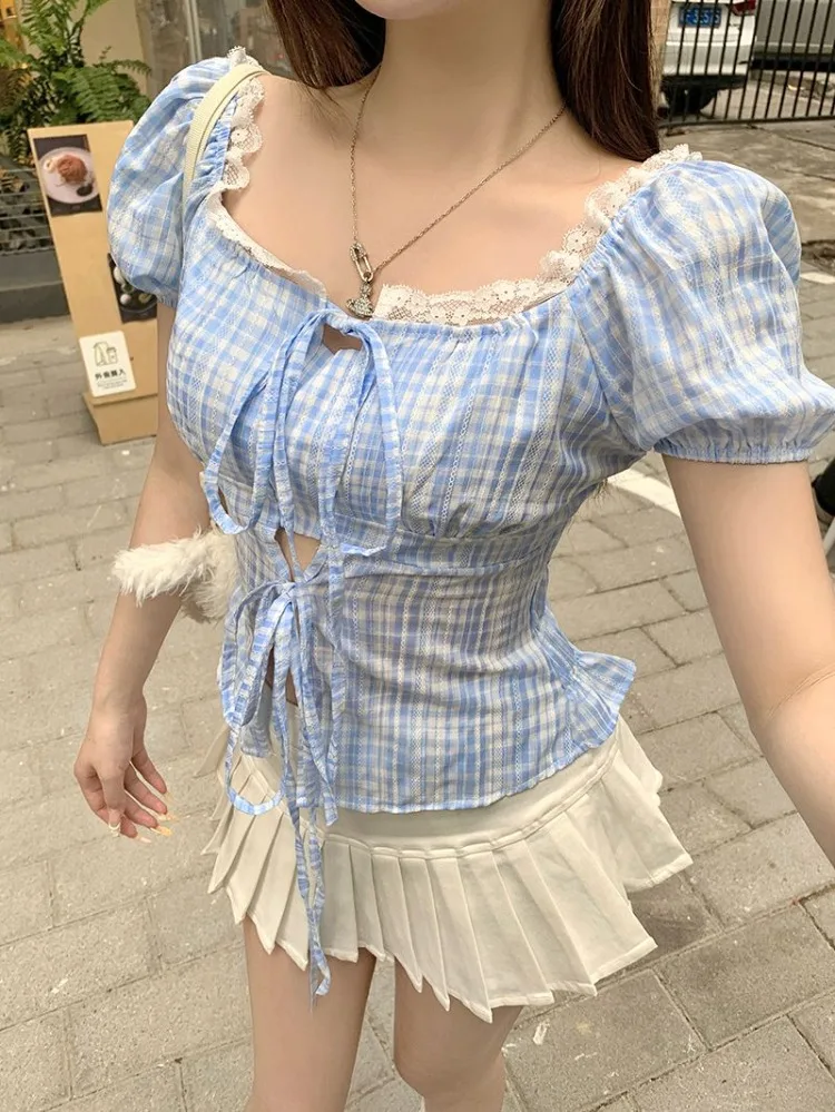 Hnewly Blouse Women Sweet Elegant Plaid Lace Patchwork Bandage Puff Short Sleeve Crop Tops Square Collar Female Casual Shirts