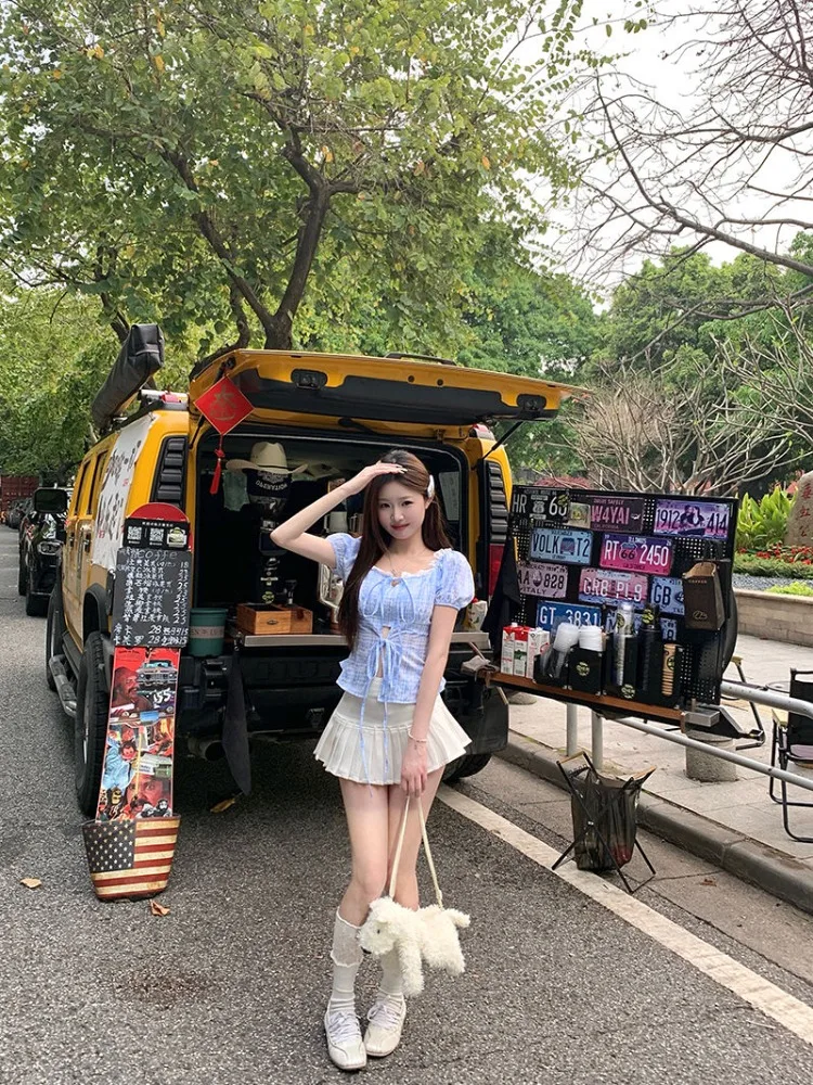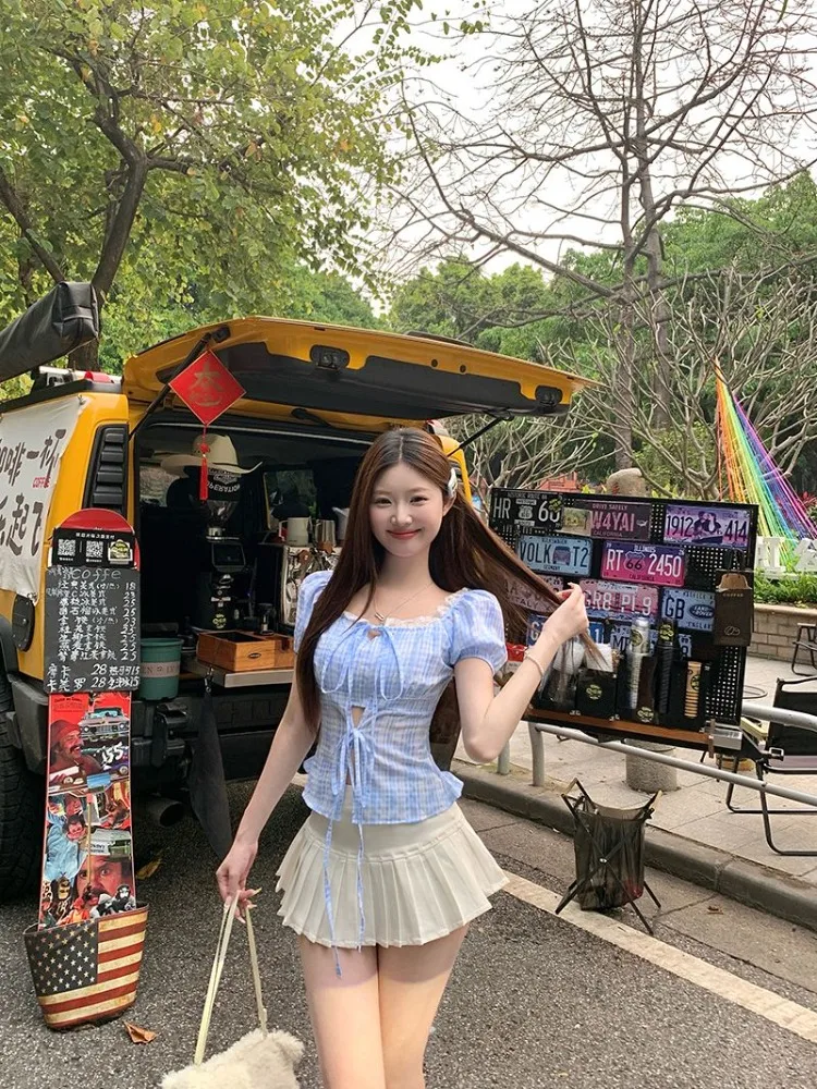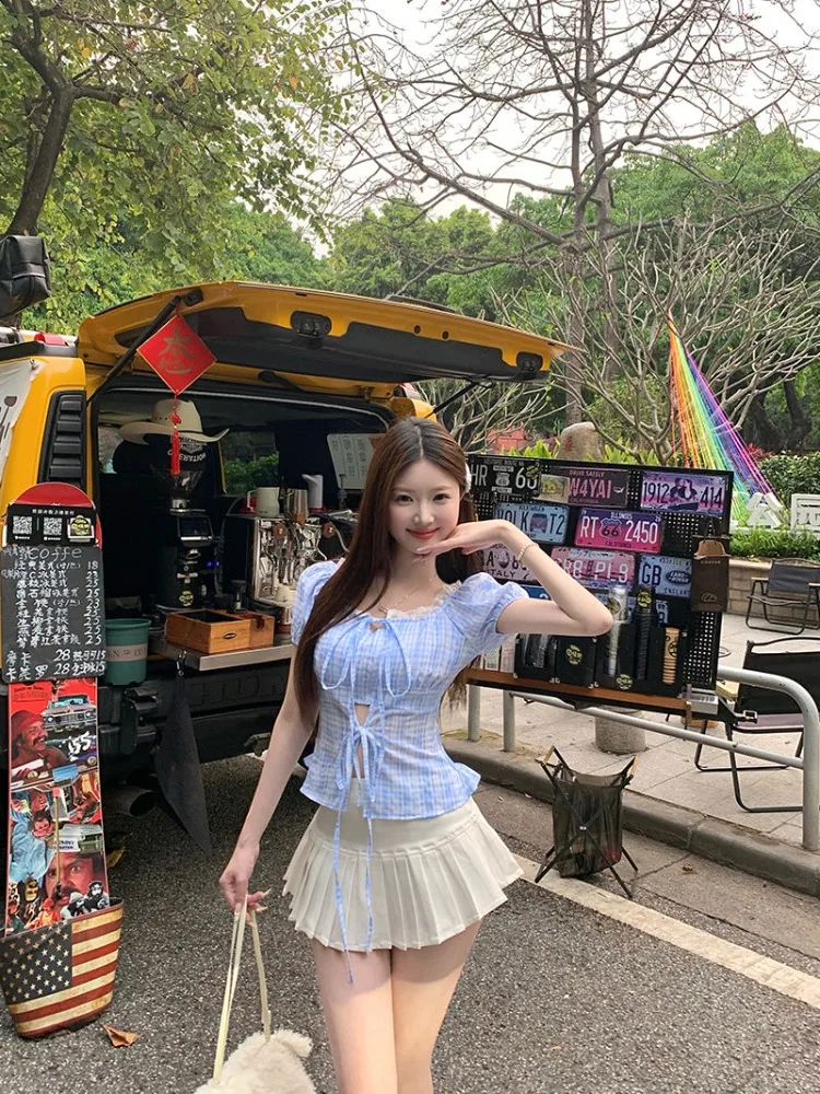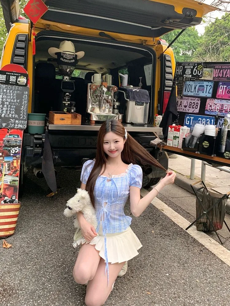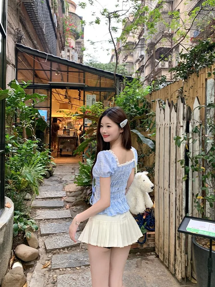 Hnewly Blouse Women Sweet Elegant Plaid Lace Patchwork Bandage Puff Short Sleeve Crop Tops Square Collar Female Casual Shirts