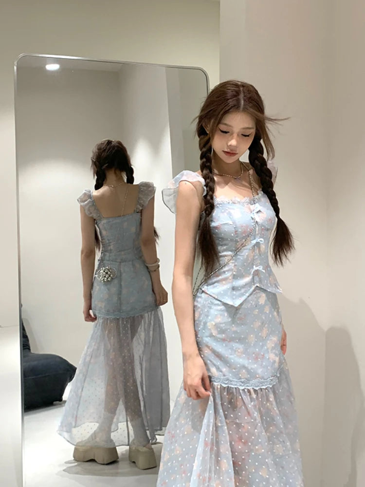 Hnewly Blue 2 Piece Dress Sets 2024 Summer French Retro Elegant Bodycon Y2k Crop Tops + Sweet Skirts Fairy Style Beach Party Aesthetic