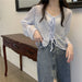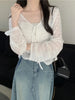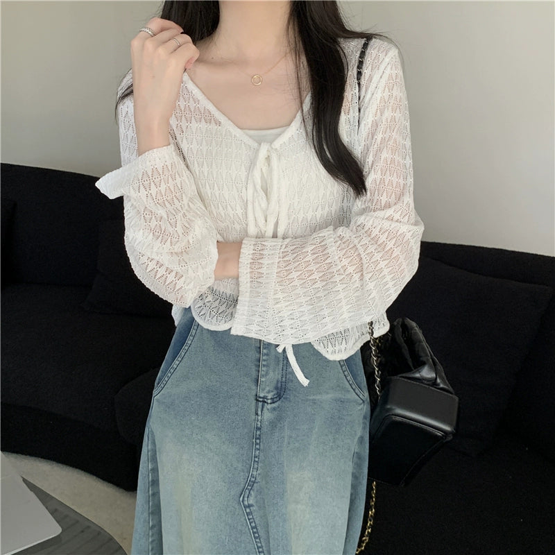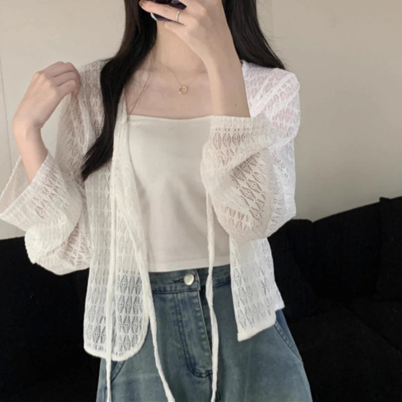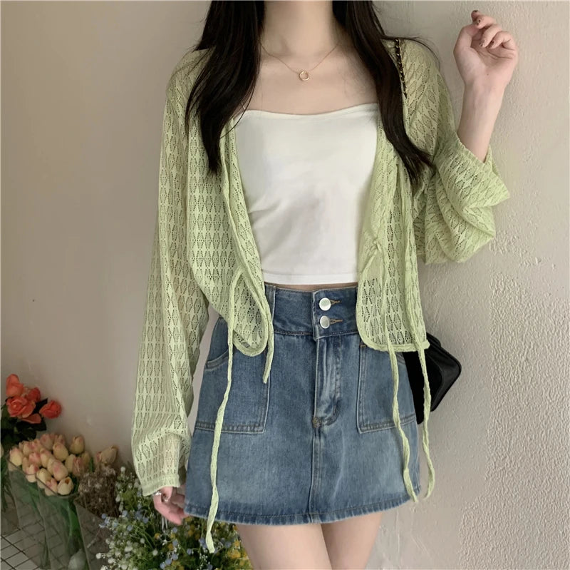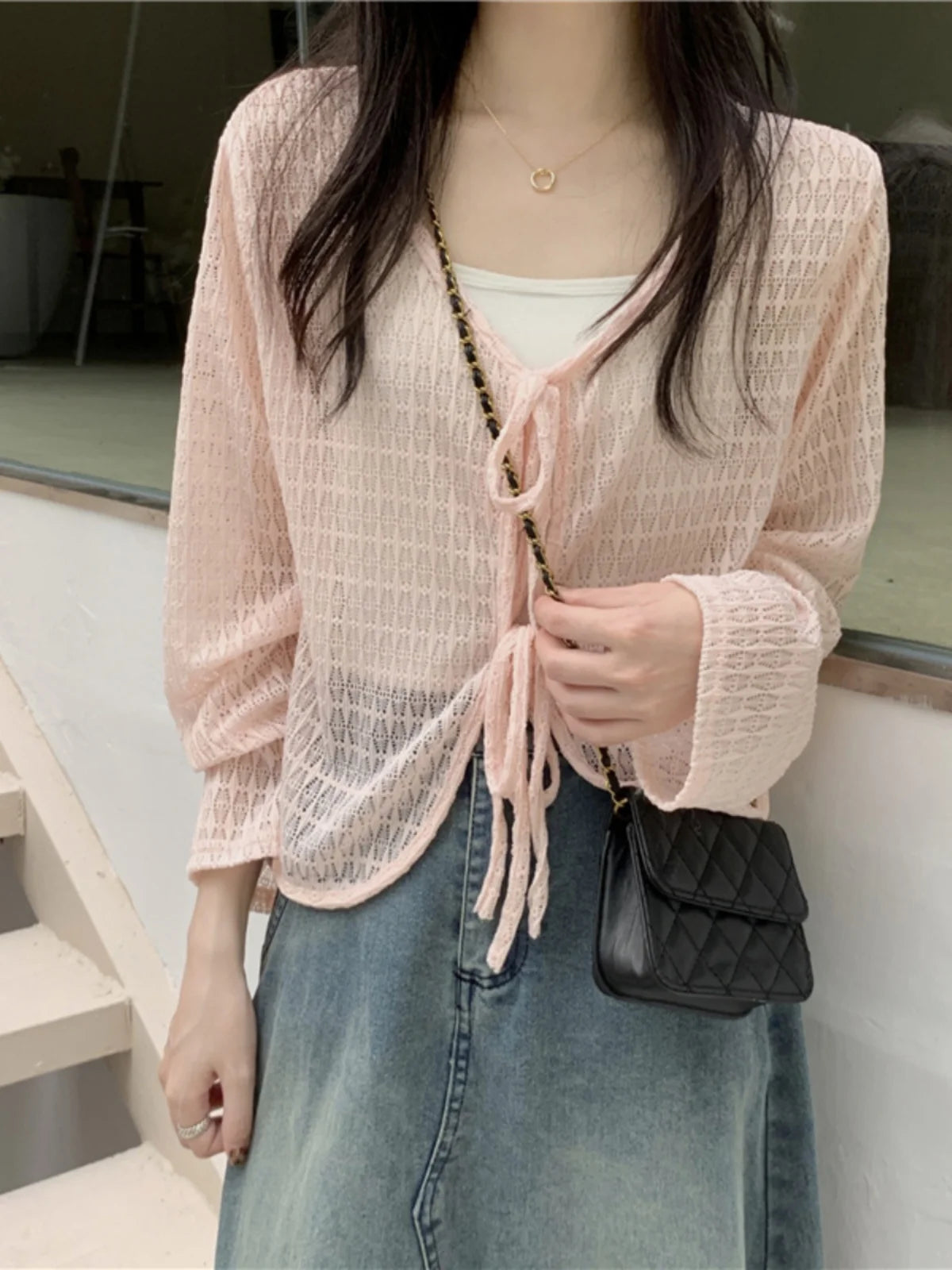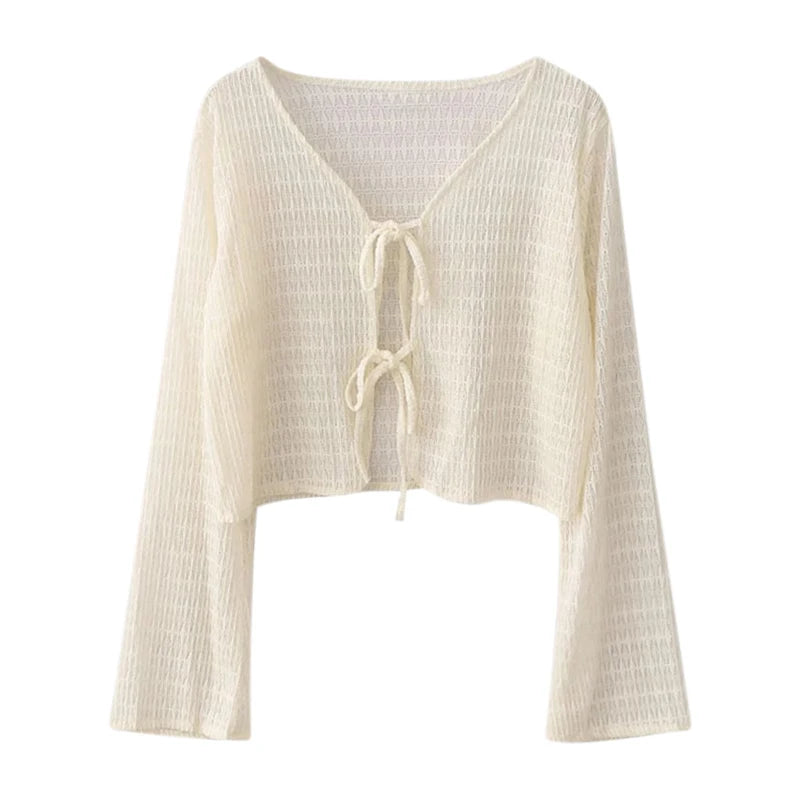 Hnewly Bow Front Cardigan for Women Petite Teen-girl Sheer Long Sleeve Tie-up Blouse Knit Top Beach Cover Up Y2K Fairycore Outfit