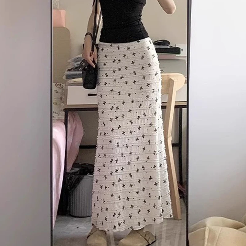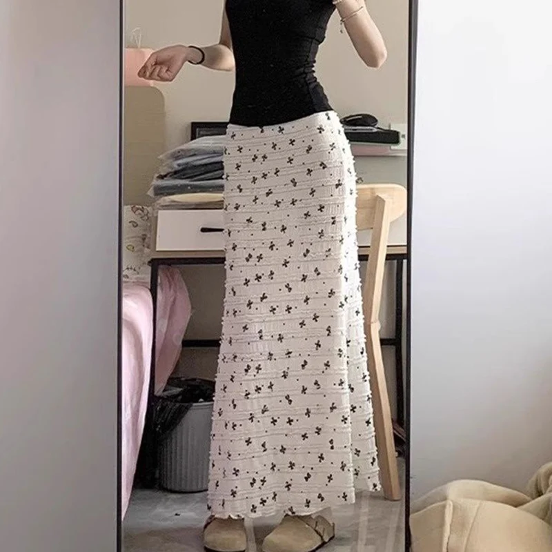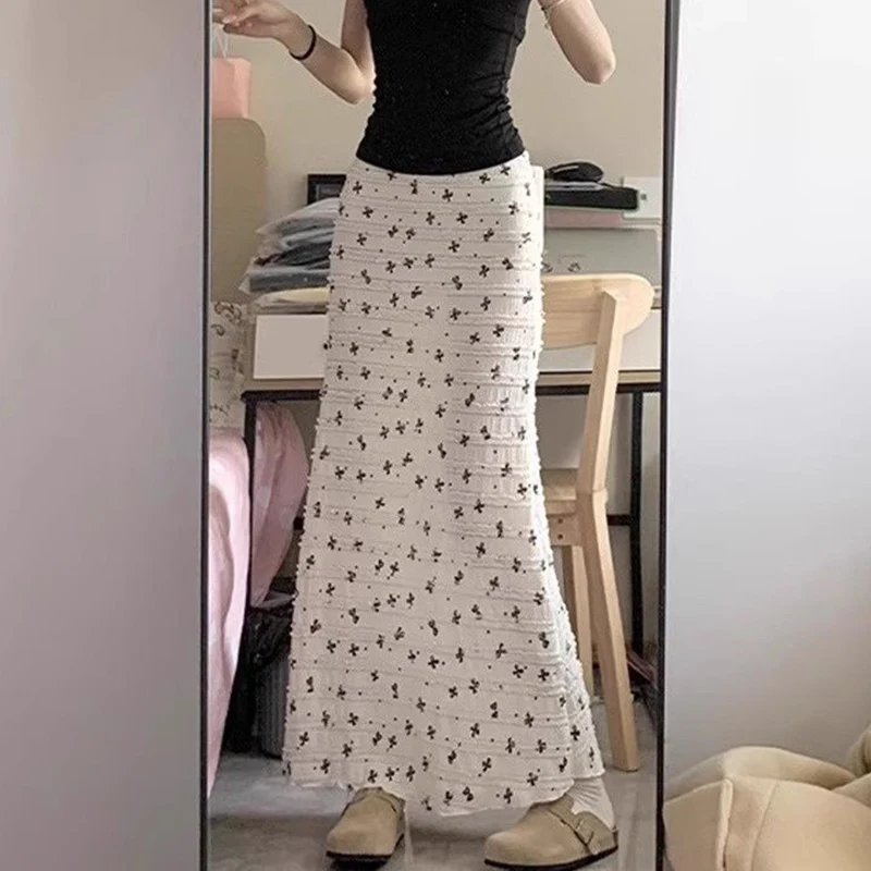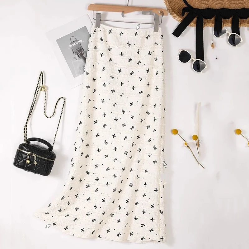 Hnewly Bow Print Lace Patchwork Mermaid Skirt Women Elegant Summer Elastic Waist Midi Skirts Lady Vacation Beige Long Skirt Female
