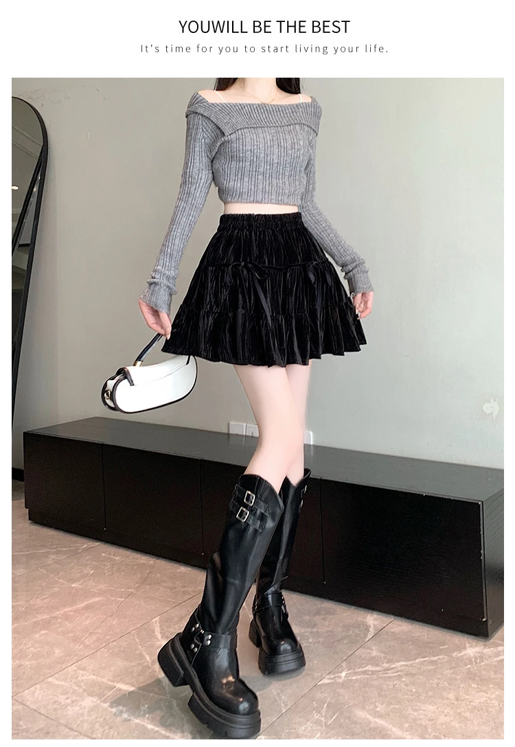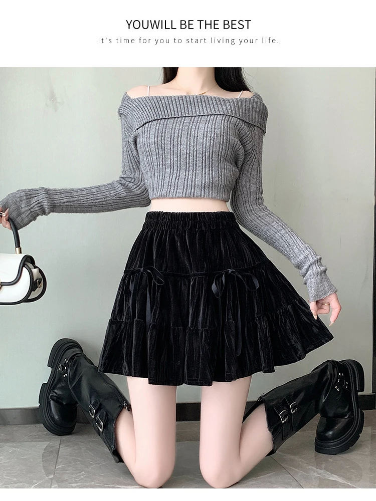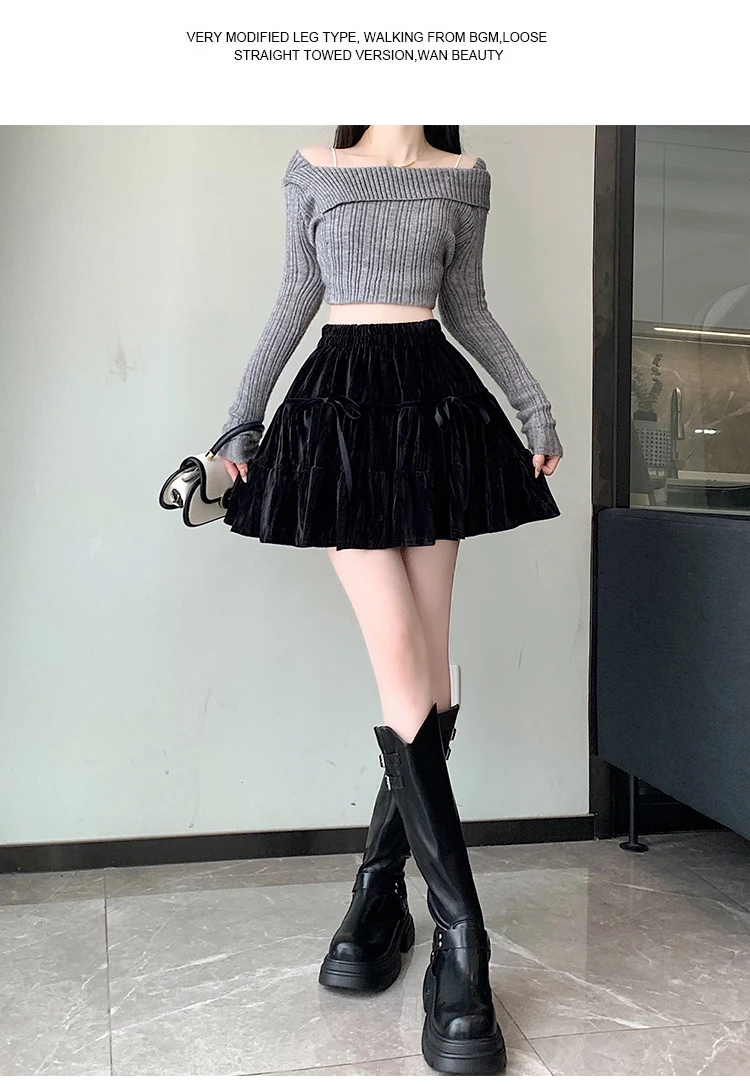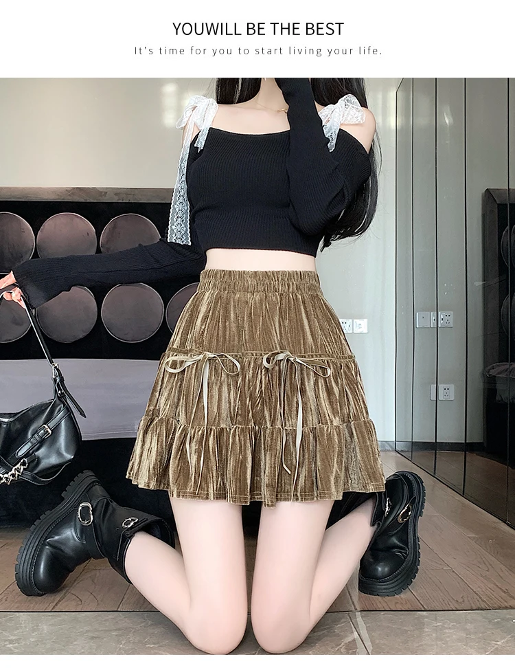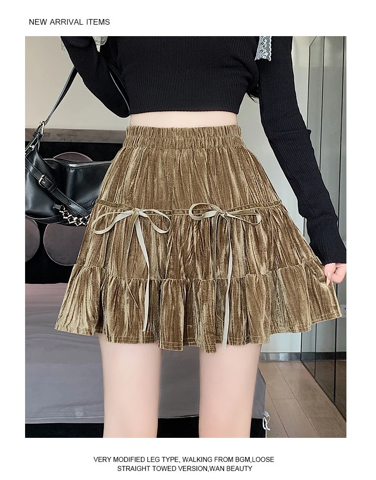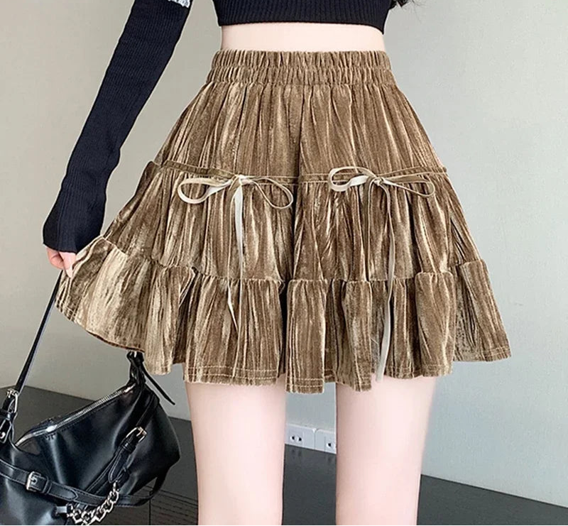 Hnewly Casual A Line Mini Kawaii Skirt Women Clothing High Waist Bow Black Faldas Largas Korean Style Harajuku Pleated Velvet Skirts